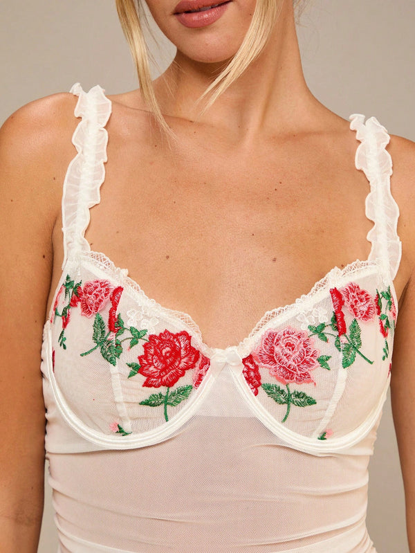 • Pattern & Detailing: Romantic floral embroidery, ruched body, ruffled shoulder straps, and lace-trimmed hem.
