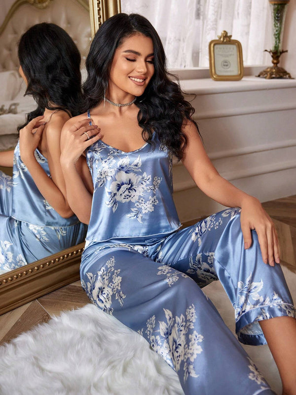 The spaghetti strap camisole and matching floral-print pants merge modern femininity with the nostalgic charm of vintage luxury.