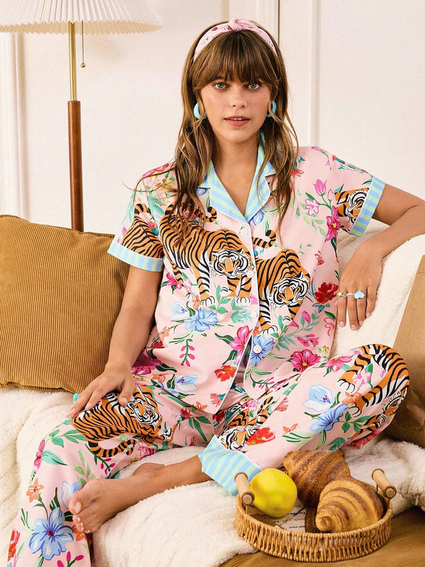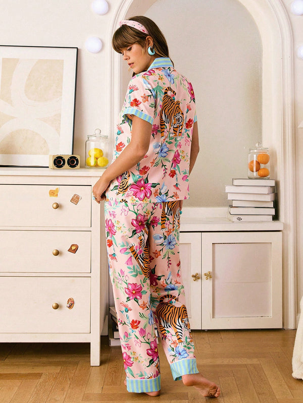The Eden Tiger Pajama Set captures the spirit of a sunrise garden, where strength prowls behind beauty. Draped in soft pink satin alive with tigers and wild blossoms, this set is a playful ode to the woman who wears serenity like silk โ€” and power like perfume.