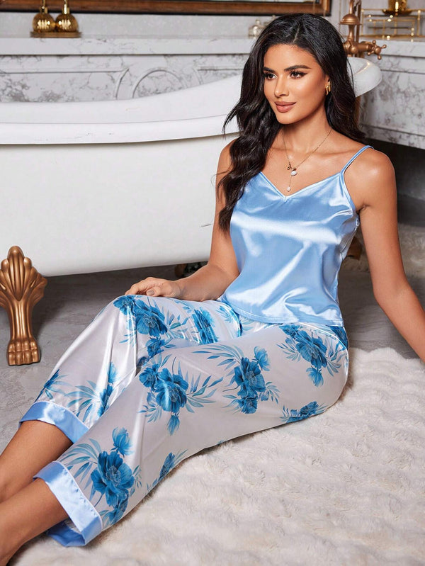 • Set Composition: Two-piece pajama set β€” satin camisole and long floral pants