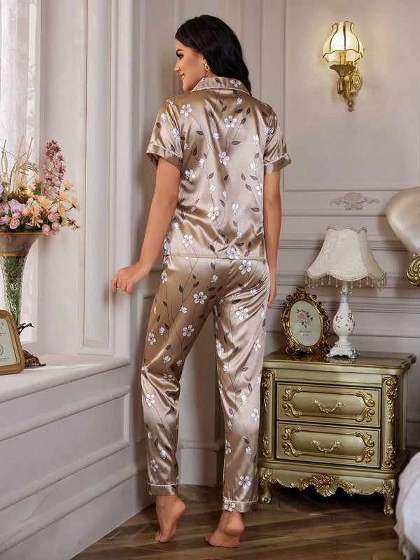 Set Composition: Two-piece satin pajama set โ button-up lapel top and full-length pants