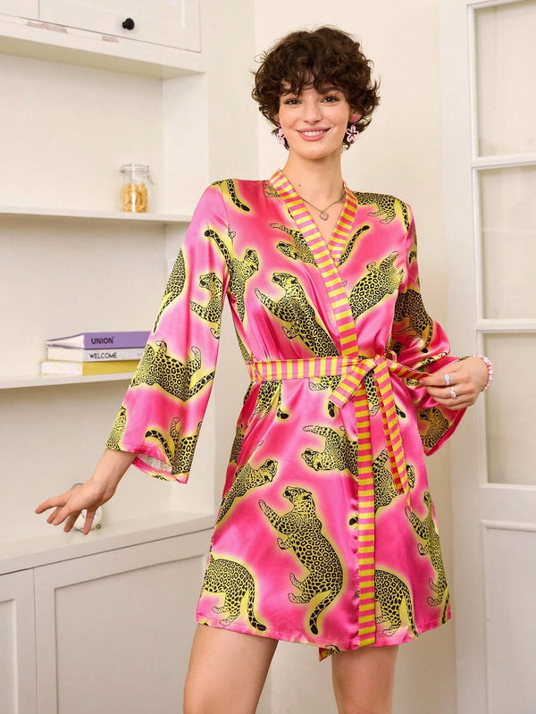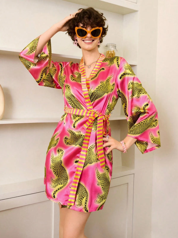 A statement of fearless femininity, this robe fuses audacious pink satin with prowling golden leopards β€” a vision of untamed luxury that feels as bold as it looks. The striped belt and trim flash a wink of mischief, grounding the wild print in tailored sophistication.