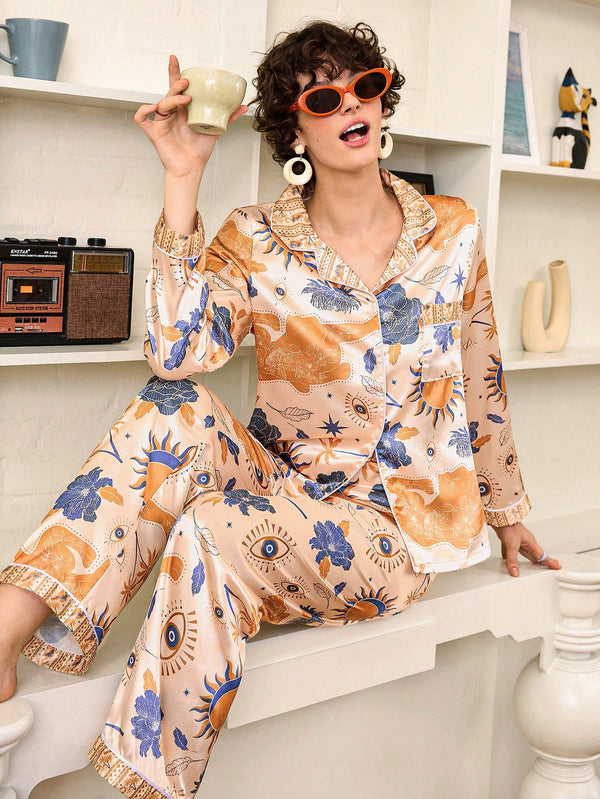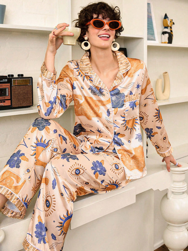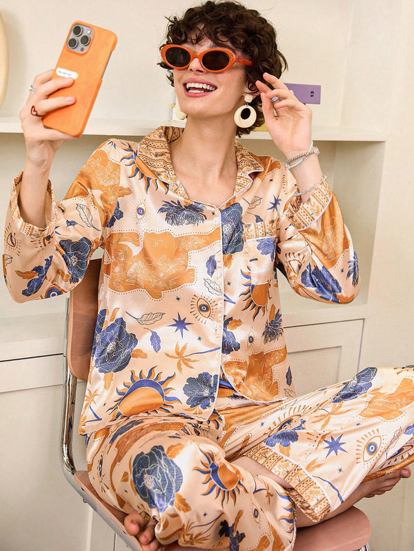 With its surreal constellation of suns, moons, and florals, this pajama set transforms every morning ritual into a slow, gilded ceremony — where comfort flirts with cosmic wonder.