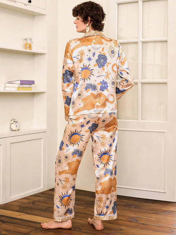Set Composition: Two-piece pajama set — button-up lapel shirt with coordinating long pants