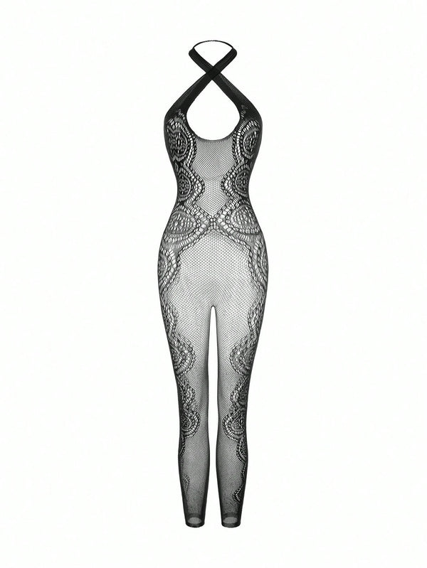 The intricate openwork design caresses every curve, while the halter neckline and open back trace a silhouette of irresistible elegance.