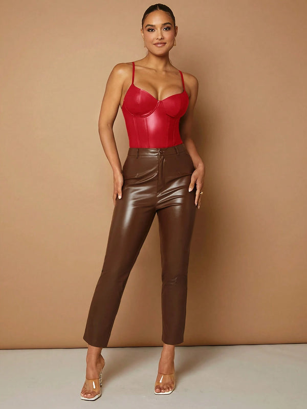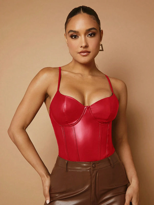 The Véra PU Leather Suspender Bodysuit is designed for women who embrace both strength and sensuality. Crafted in glossy red imitation leather, this statement piece fuses sleek structure with supple movement. Its spaghetti straps and backless silhouette strike the perfect balance between daring and refined — a modern essential for nights when presence becomes power.