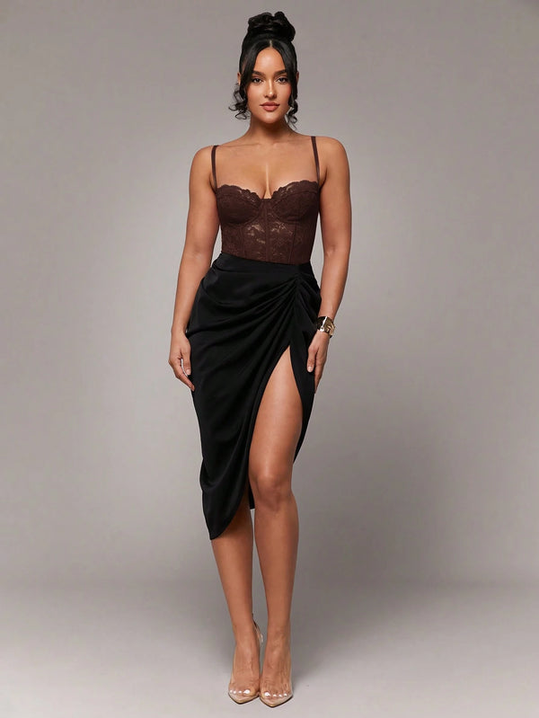 The Vivienne Lace Splice Sheer Bodysuit embodies sensuality refined — a symphony of sheer fabric, delicate lace, and fluid confidence. Designed with a daring backless cut and fine spaghetti straps, it sculpts the silhouette with ease while tracing every curve in soft sophistication. Vivienne is the ultimate expression of allure — equally captivating for intimate evenings or styled boldly as statement wear.
