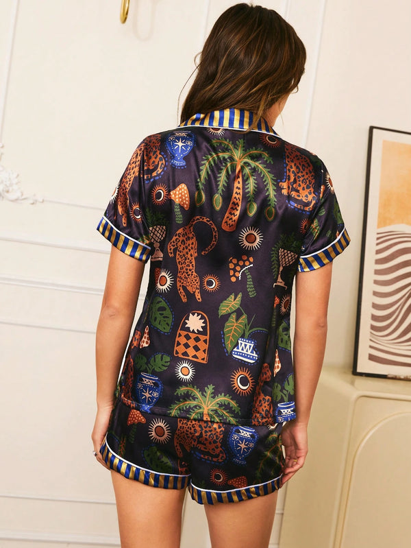 This pajama set reimagines nightwear as wearable art β€” a kaleidoscope of leopards, palms, and cosmic motifs dancing across inky satin. It’s the embodiment of nocturnal glamour: bold yet fluid, striking yet soft.