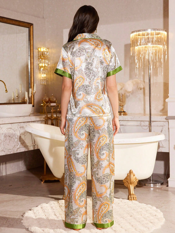 • Set Composition: Two-piece pajama set โ€” short-sleeve lapel top and full-length pants