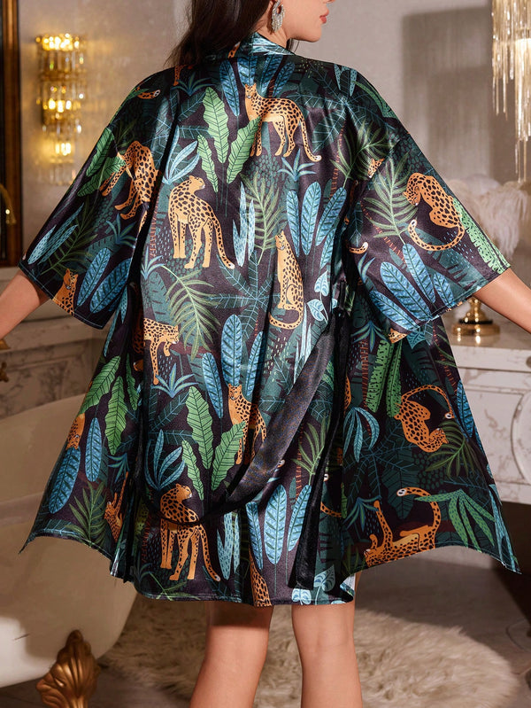 The bathrobe, adorned with botanical and animal-inspired prints, wraps the silhouette in vibrant calm โ belted lightly at the waist to create a vision of balance and beauty.