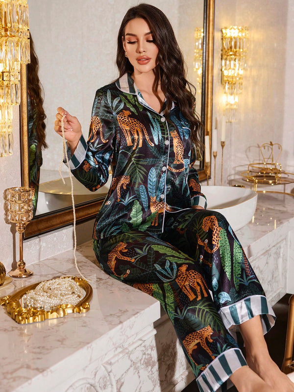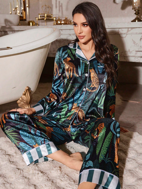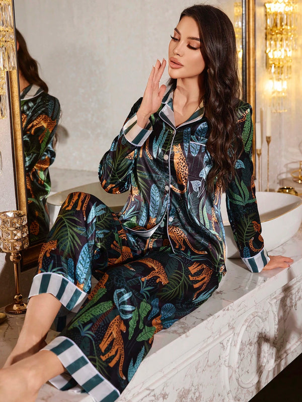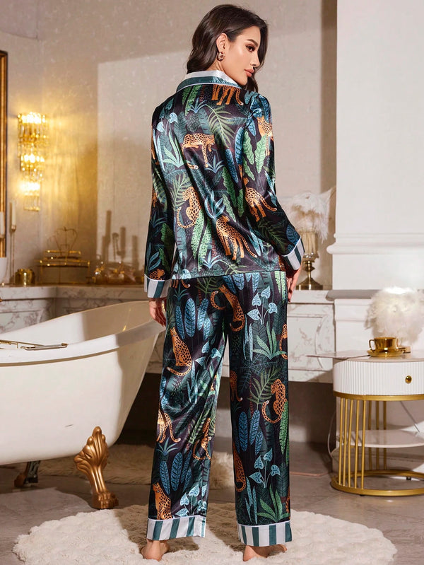 The Midnight Jungle Pajama Set is a vision of untamed sophistication โ€” a lush celebration of natureโ€™s beauty and nocturnal allure.