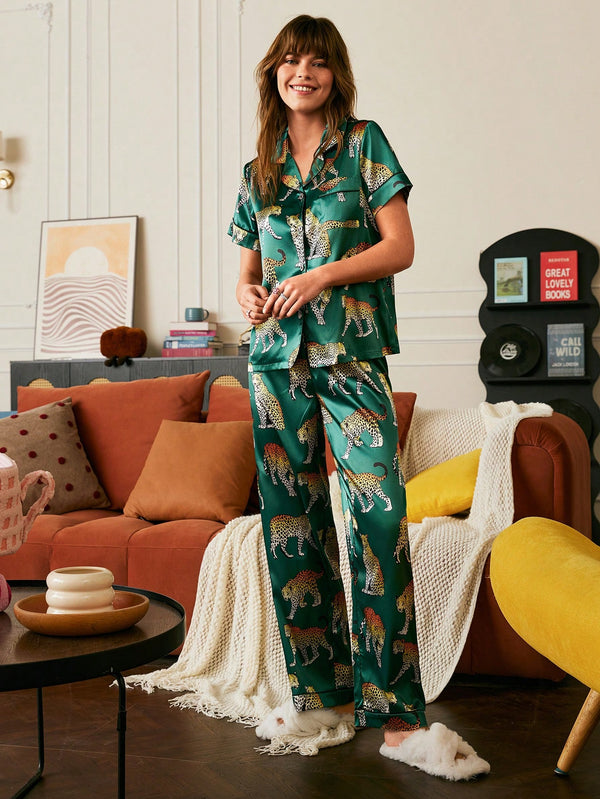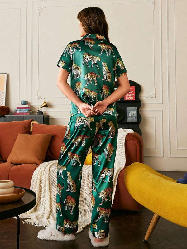 The Emerald Prowess Pajama Set captures the essence of fearless femininity: lush green satin adorned with golden leopards, an homage to grace that never needs to roar. Each fold glints with quiet opulence, a symbol of both ease and allure.