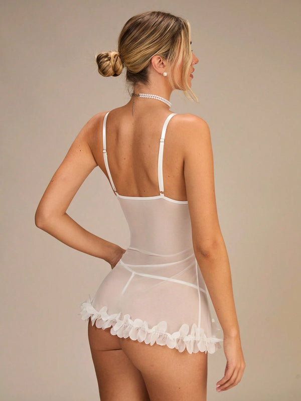 • Pattern & Detailing: Floral lace with satin bow accents and sheer mesh body; 3D chiffon petal trim at hem.