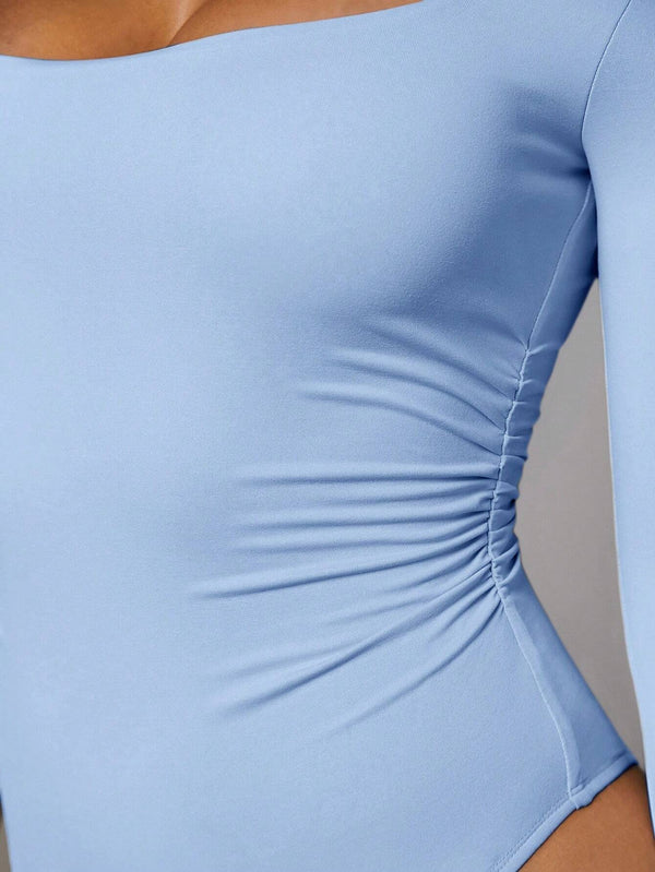 The Céleste Square Neck Bodysuit captures the essence of effortless elegance for every season. Designed in a serene baby blue hue, it pairs simplicity with sophistication — ruched detailing enhances the silhouette, while the square neckline frames the collarbone with subtle femininity. Whether worn casually or styled for homecoming evenings, Céleste embodies quiet confidence in motion.
