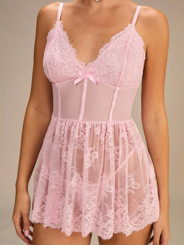 Crafted from semi-sheer pink lace with a satin-soft mid-bodice, it glows with quiet grace, wrapping the body in delicate romance.