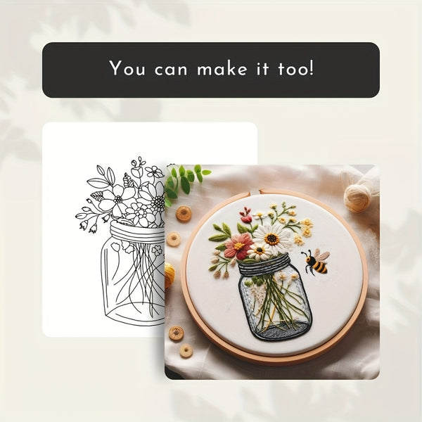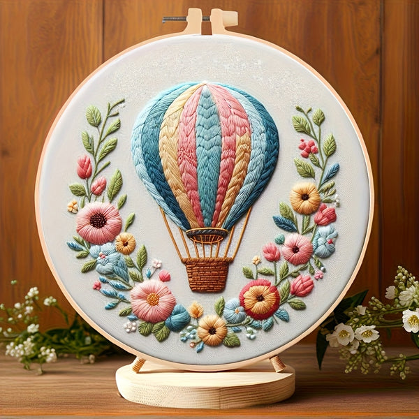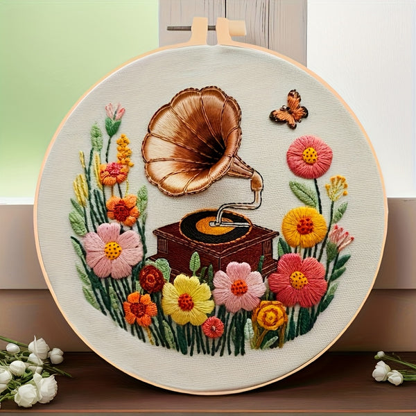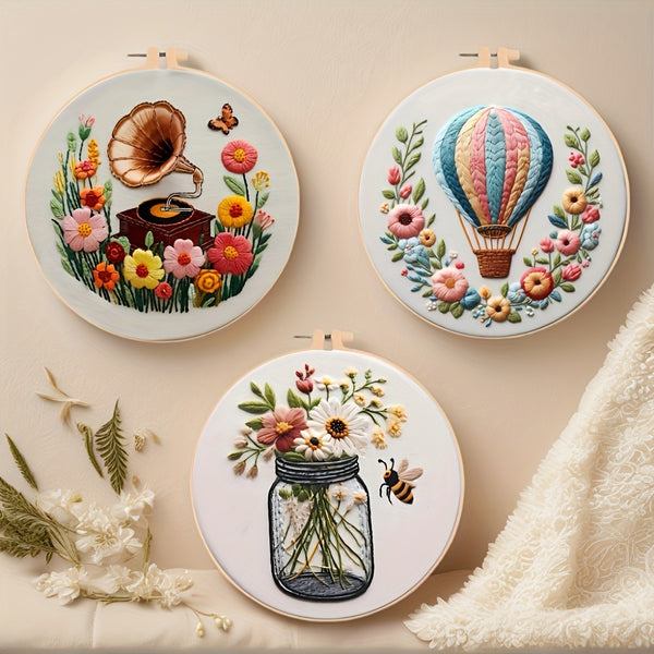 3-Pattern Beginner Embroidery Kit – Phonograph, Hot Air Balloon & Bee Vase Designs – 8" Hoop, Pre-Printed Fabric, Threads & Needles, English Guide
