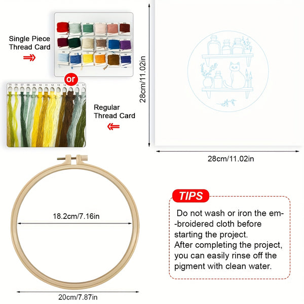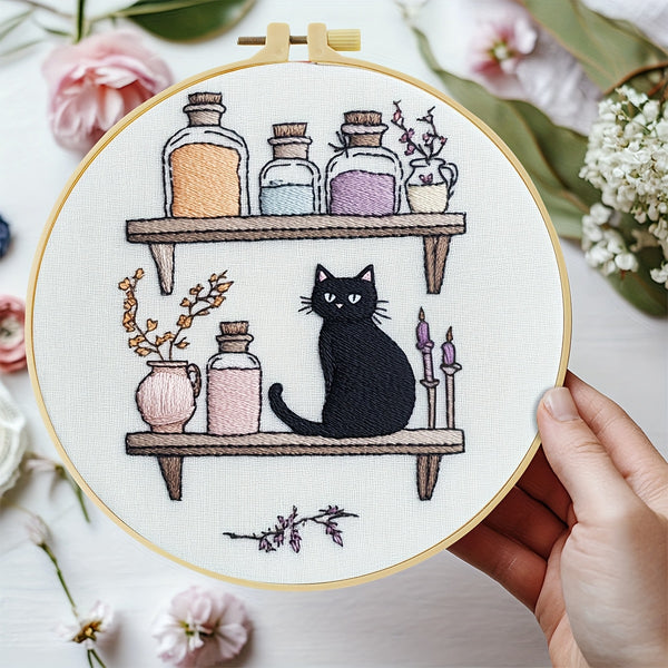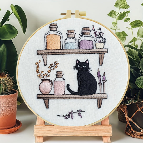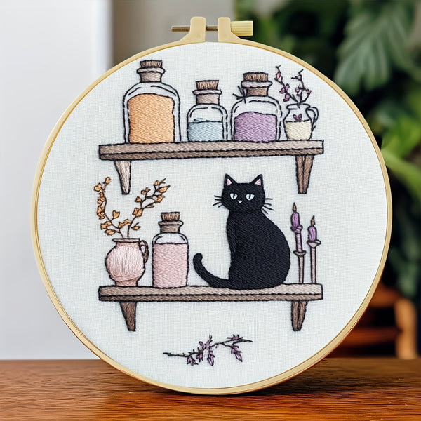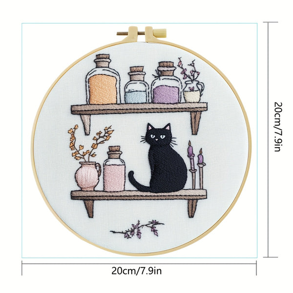 Black Cat Embroidery Kit – Beginner DIY Stitch Set with Fabric, Hoop & Threads | Cute Handmade Gift for Home & Holiday Décor