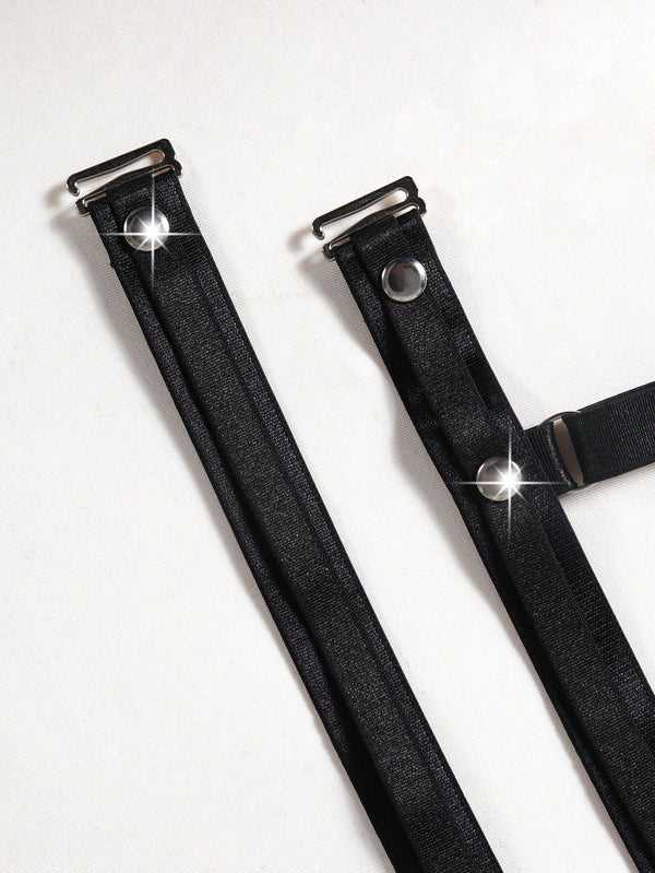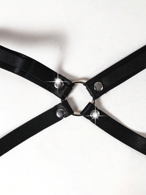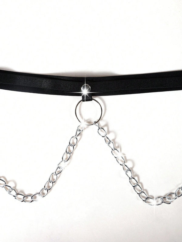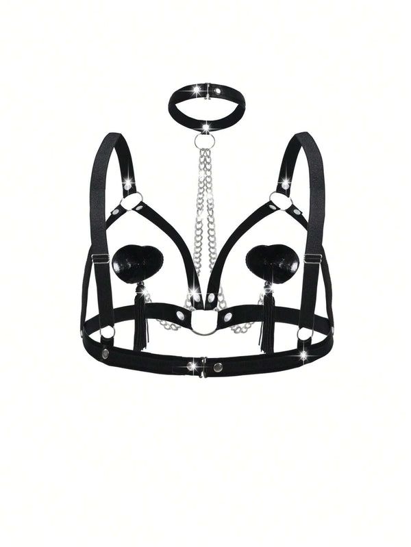 black chain harness, festival body accessory, punk chain top, adjustable harness crop top, gothic body jewelry, polyester harness, cosplay festival wear, metallic chain harness, gothic women’s accessory, discreet packaging