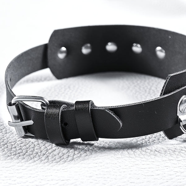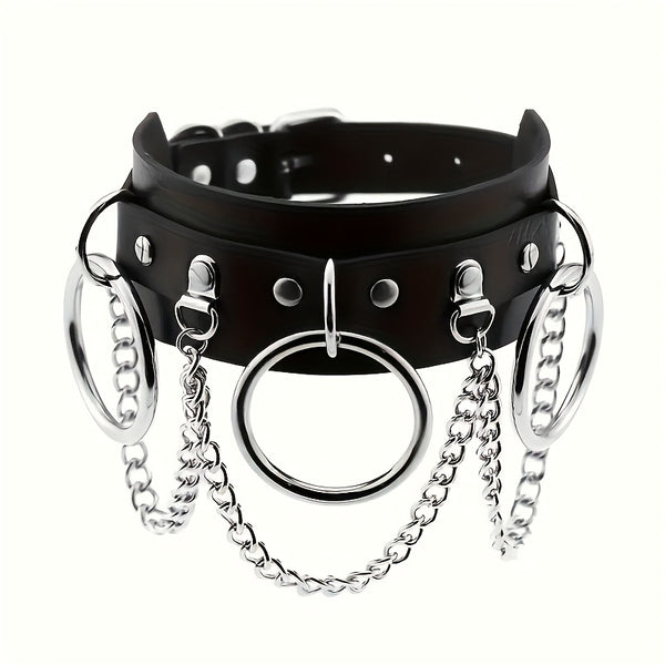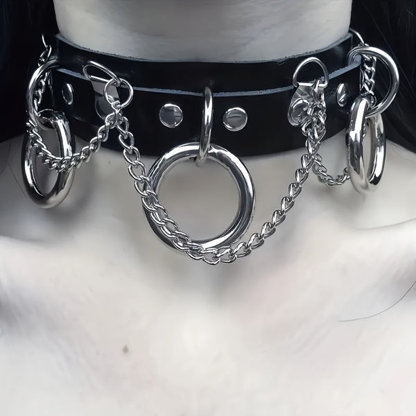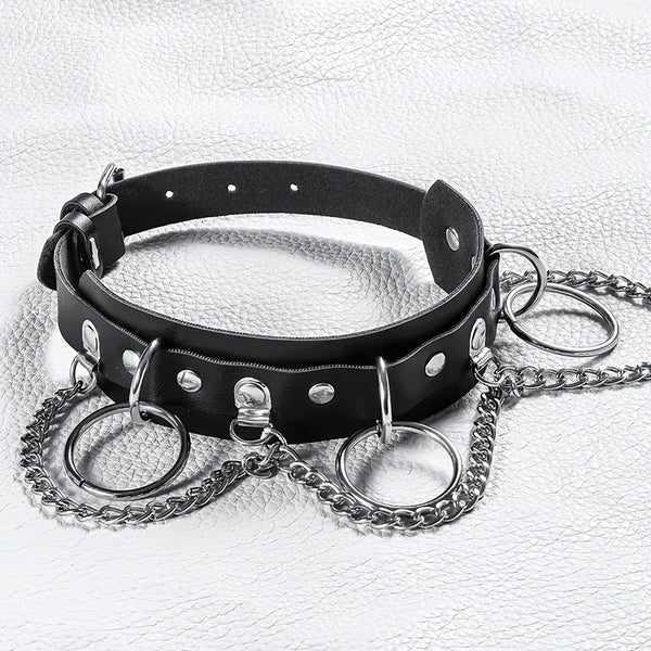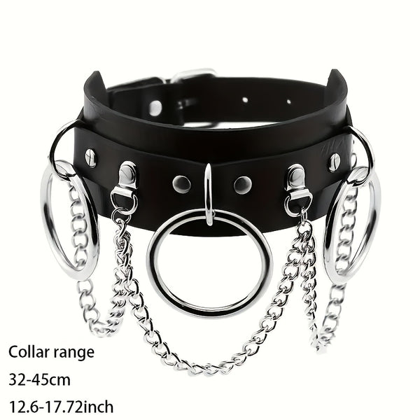 Adjustable Gothic Punk Faux Leather Choker with Chains and Rings