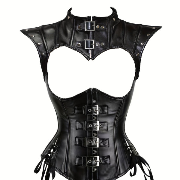 Command attention with this Dark Gothic Steampunk Corset Set from BadBLingerie, featuring a structured faux leather underbust corset with metal buckle closures, and an attached studded shoulder cape for dramatic flair.
