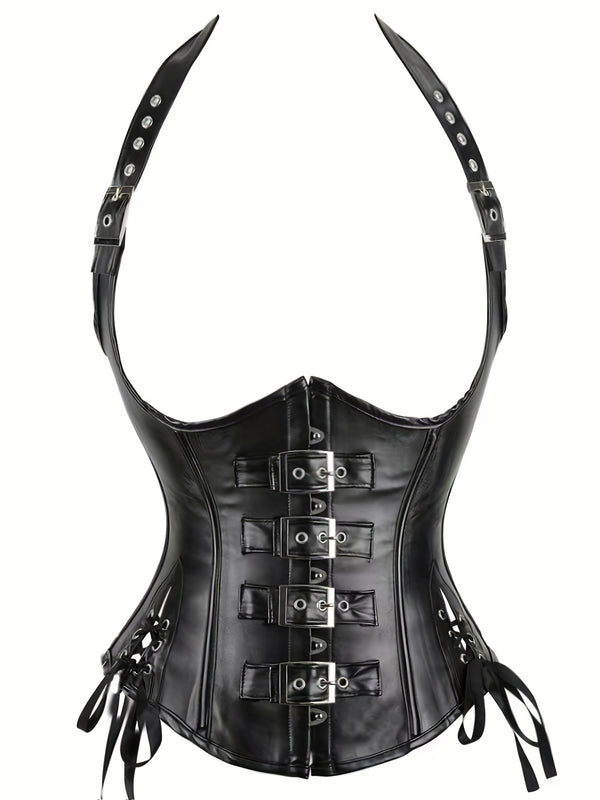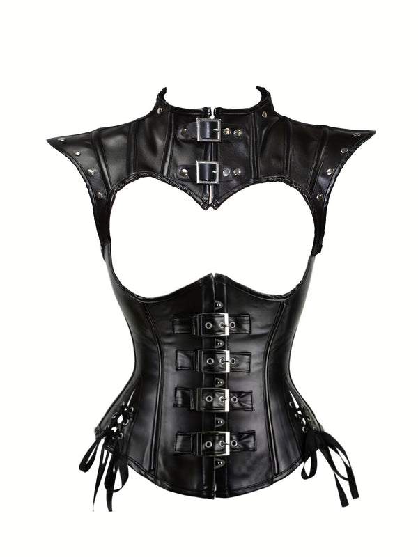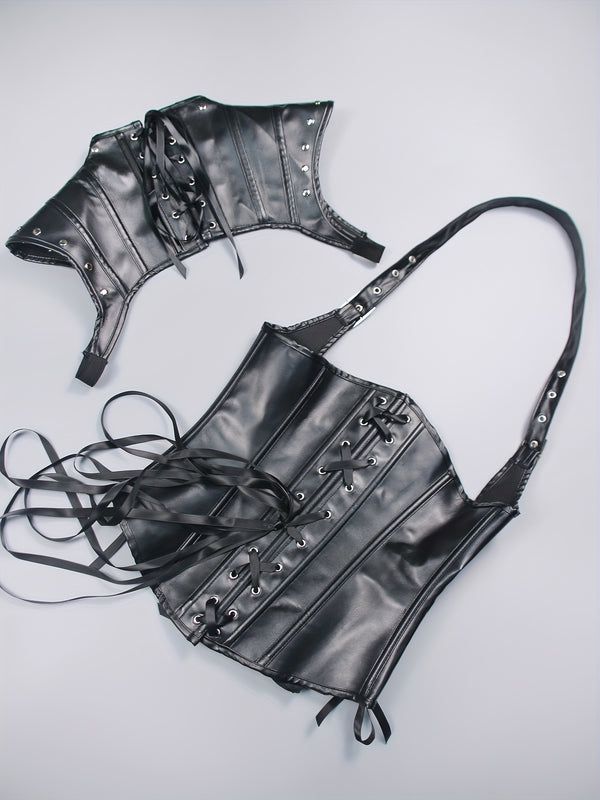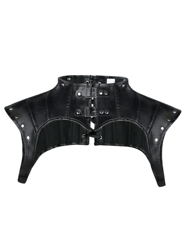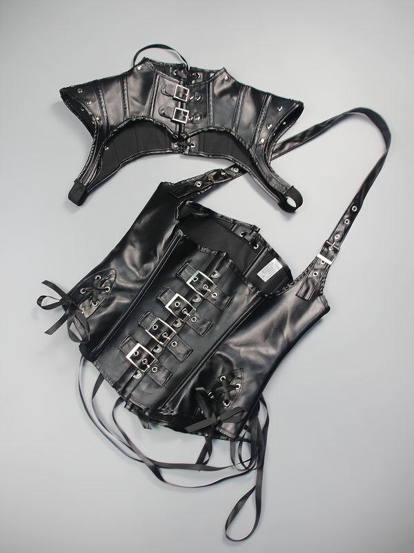Black Faux Leather Gothic Steampunk Corset Set –Shoulder Cape & Buckle Corset | BadBLingerie Festival Outfit, Halloween Costume, Cosplay Waist Cincher