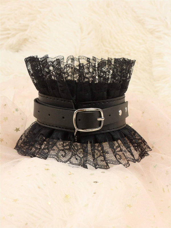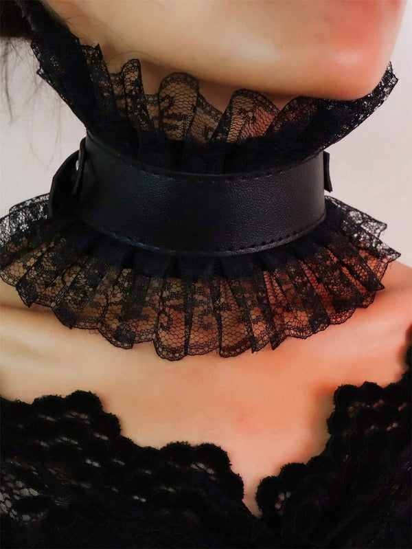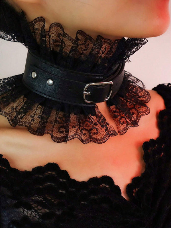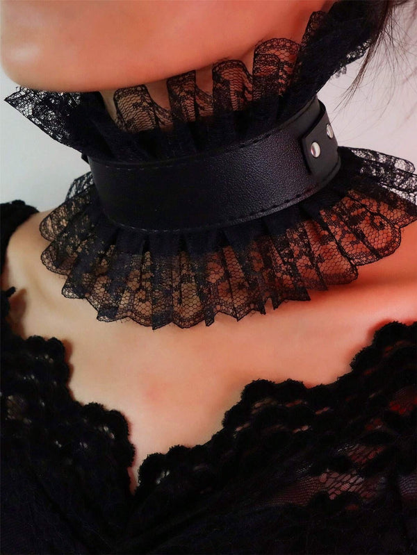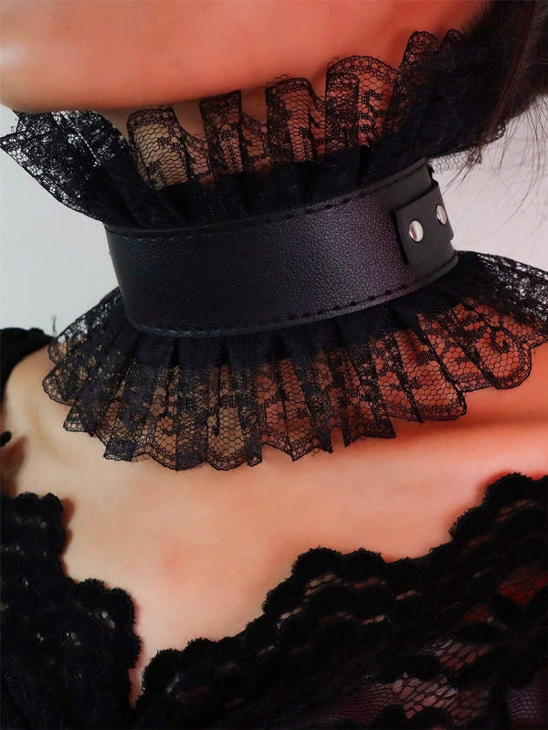 • PU leather collar layered with delicate black lace ruffles
