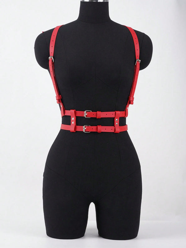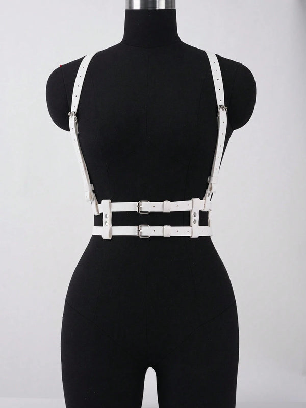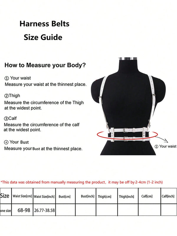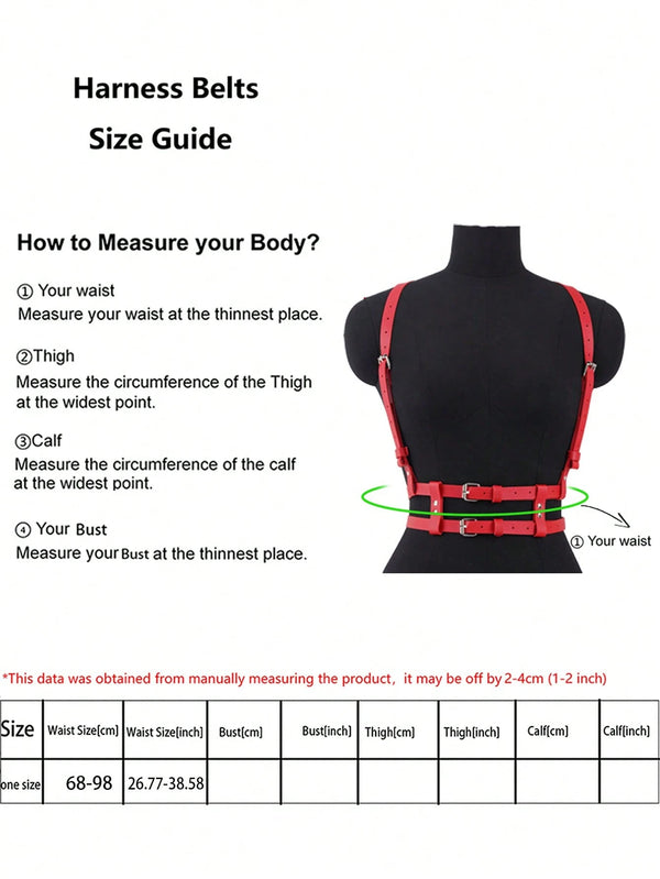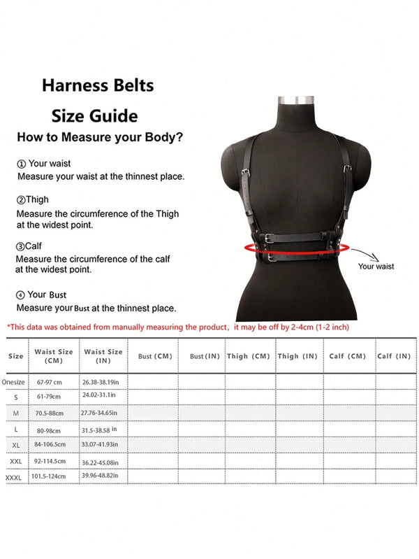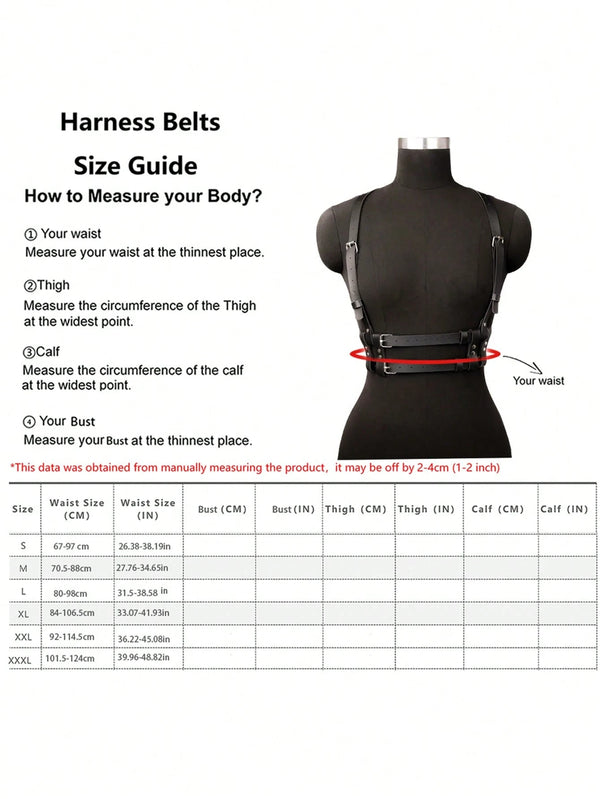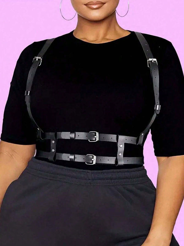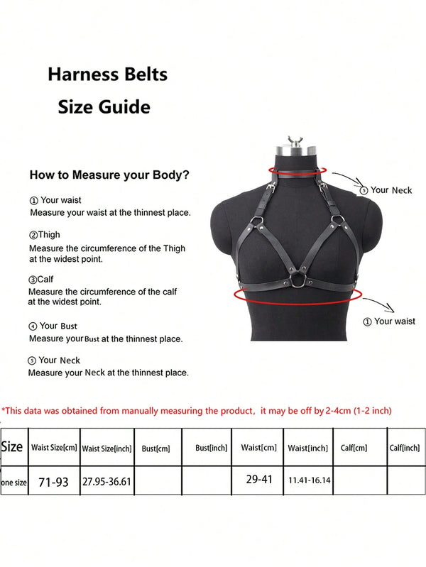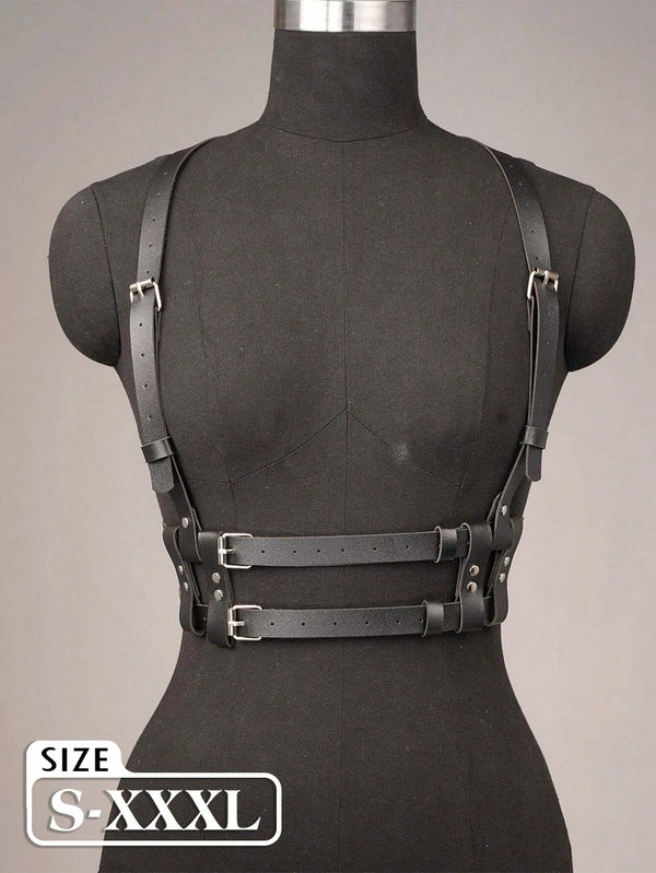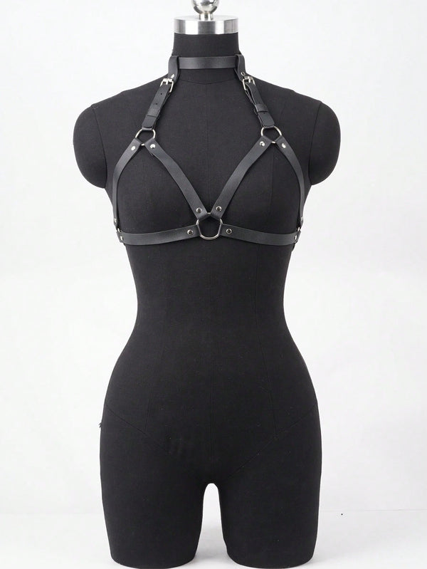 black leather harness, chest harness belt, gothic leather body belt, adjustable PU harness, festival fashion accessory, cosplay chest belt, women’s gothic harness, structured leather harness, statement body accessory, discreet packaging