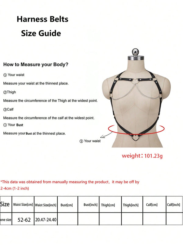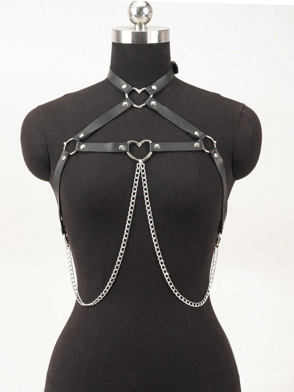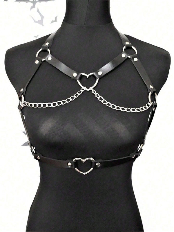 Black PU Leather Heart Chain Chest Harness – Adjustable Gothic Punk Body Cage for Women, Sexy Festival Lingerie Accessory