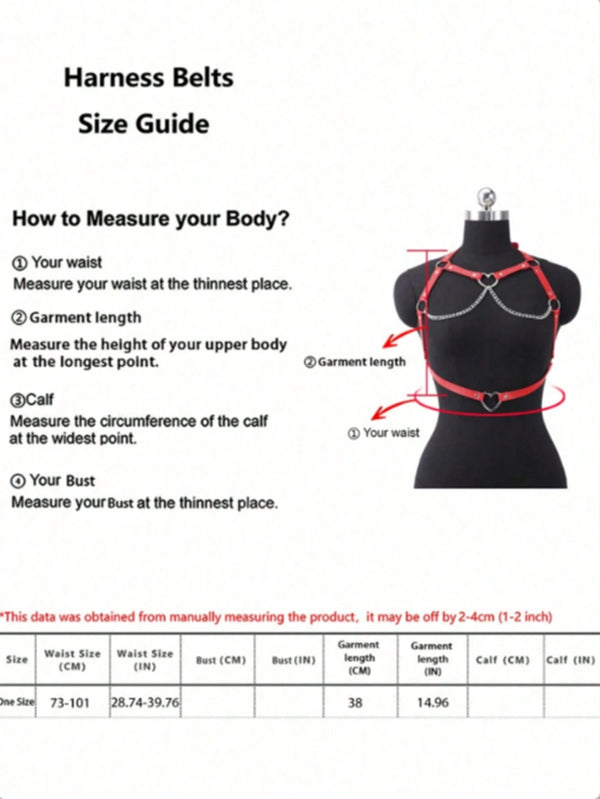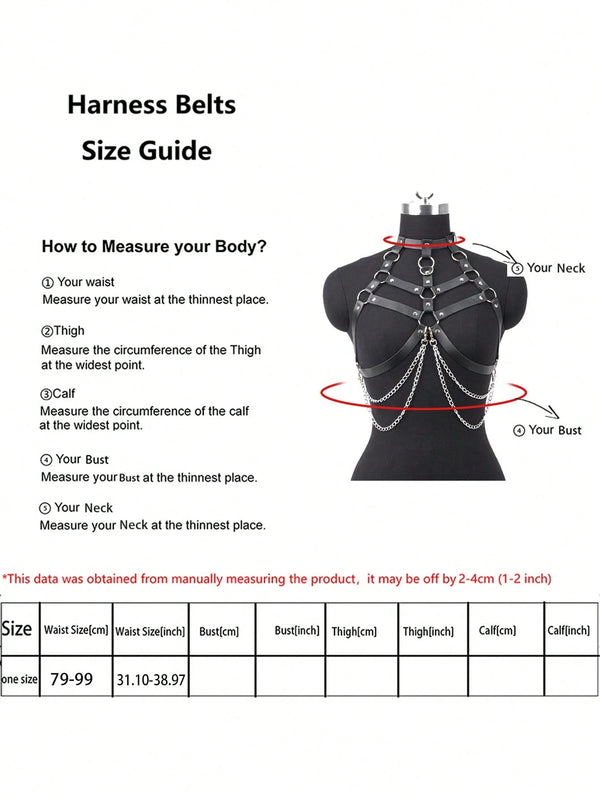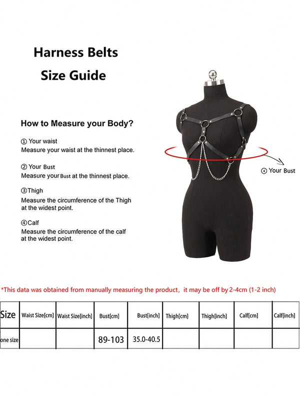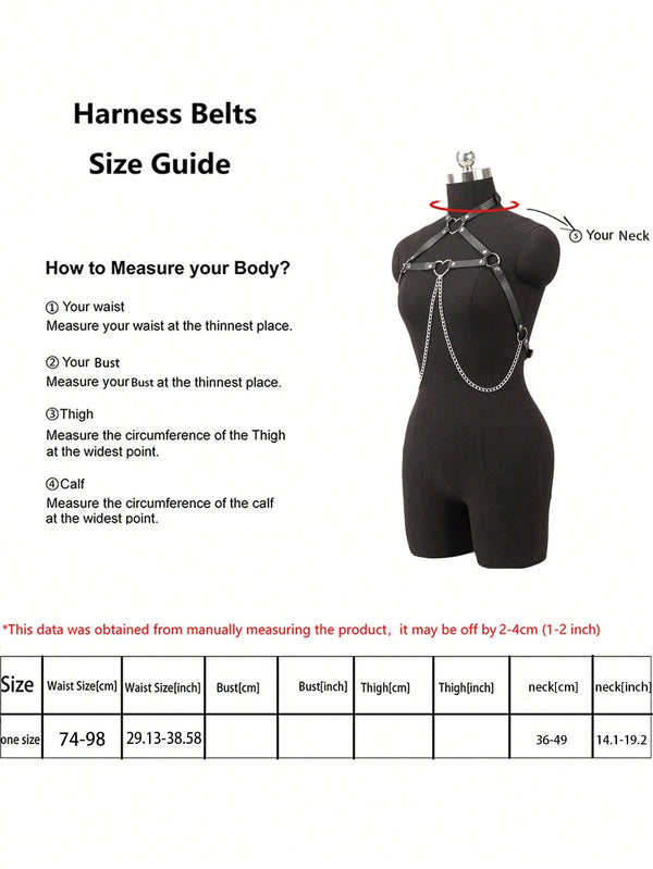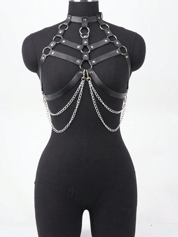 The Seraphine Harness embodies the fusion of rebellion and romance. Crafted in sleek black PU leather and adorned with silver-tone heart rings and cascading chains, this piece blurs the line between armor and adornment.