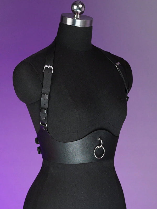 Black PU Leather O-Ring Waist Belt Harness – Adjustable Corset Style Women’s Fashion Accessory | Gothic Retro Vest Belt | Discreet Packaging