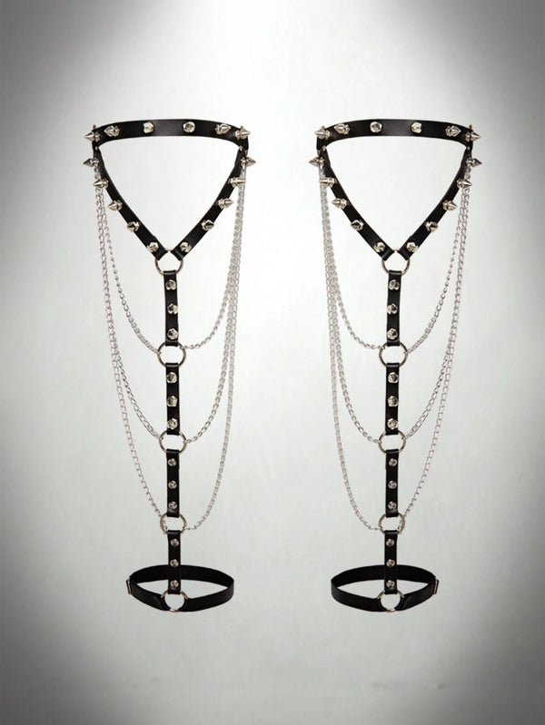 The Black Spiked Leather Leg Harness blends punk energy with seductive sophistication. Featuring gleaming metal chains and geometric straps, this statement leg accessory wraps around your thighs and calves with confidence and control. Perfect for festivals, lingerie looks, photo shoots, or night-out styling, it embodies pure alt-fashion attitude.