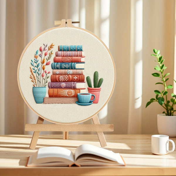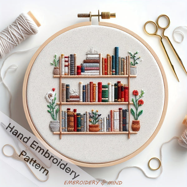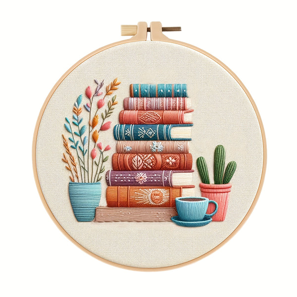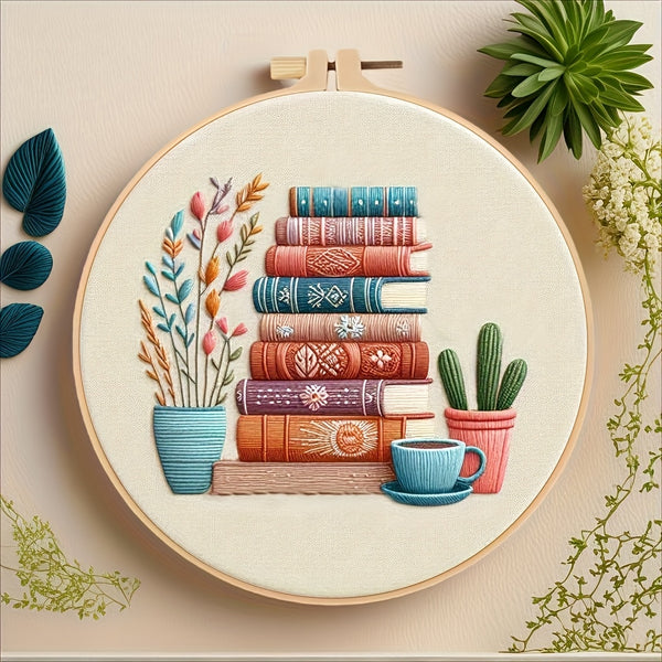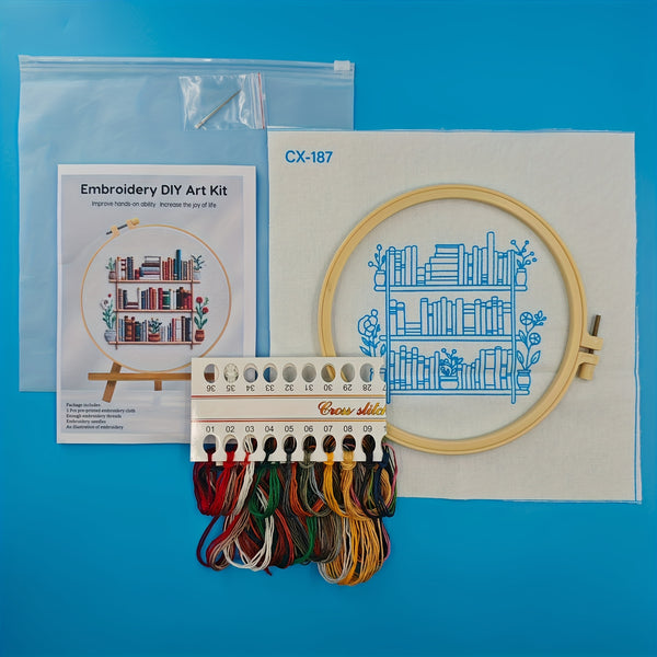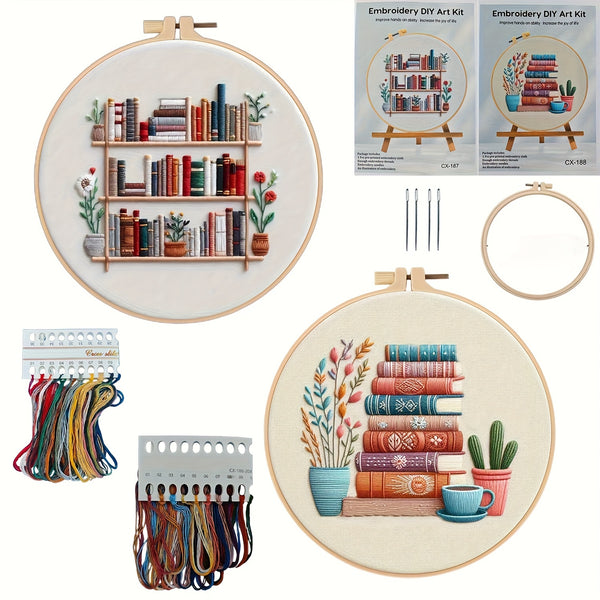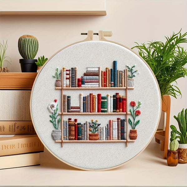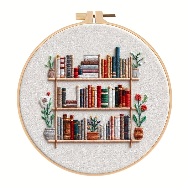 Bookshelf & Flowers Embroidery Kit for Beginners – Complete DIY Set with Printed Pattern, Hoop, Threads & Needles – Holiday Gift & Home Decor