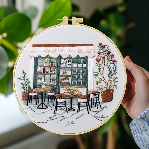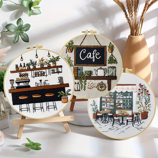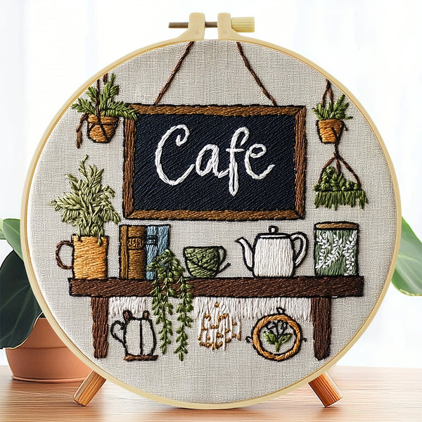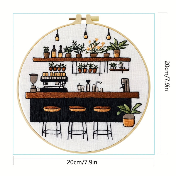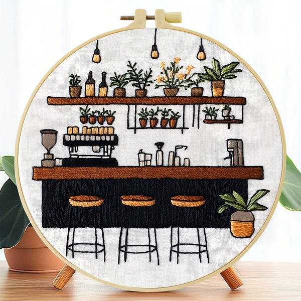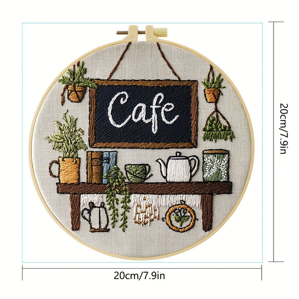 Café Embroidery Kit for Beginners – DIY Coffee Shop Shelf Design with Pre-Printed Fabric, Hoop, Threads & Needles – Cute Craft Gift & Decor