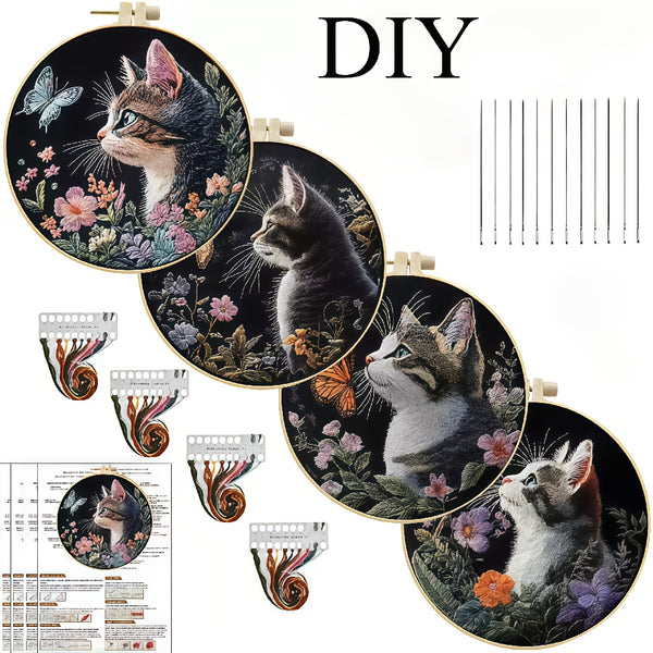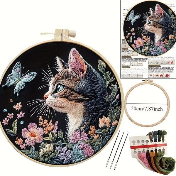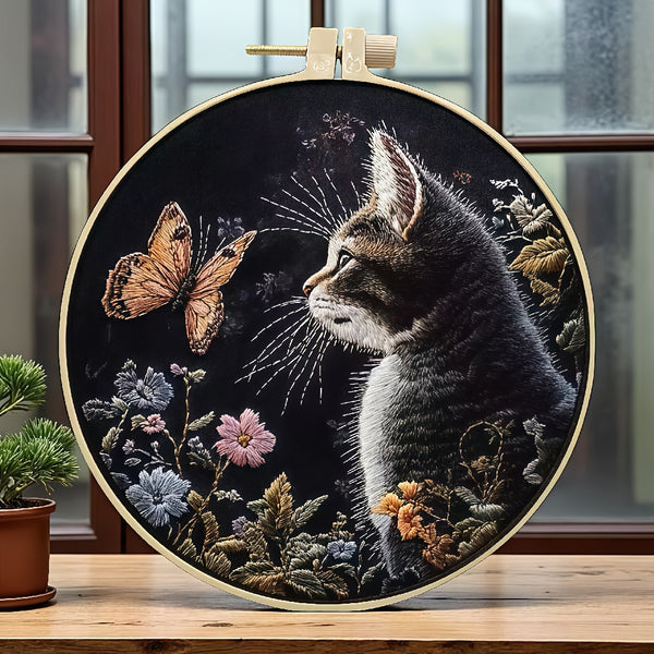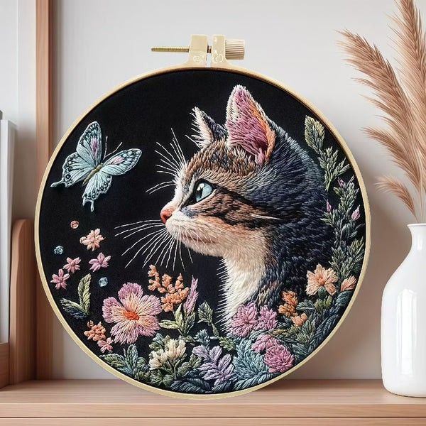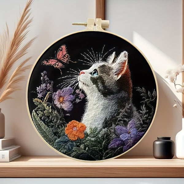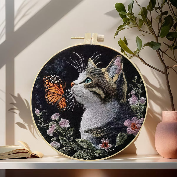 Cat & Butterfly Embroidery Kit for Beginners – DIY Floral Design with Pre-Printed Fabric, Hoop, Threads & Needles – Cute Craft Gift & Decor
