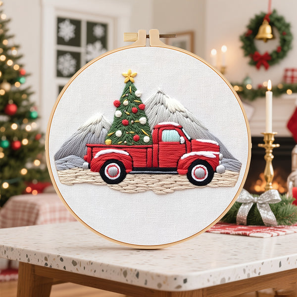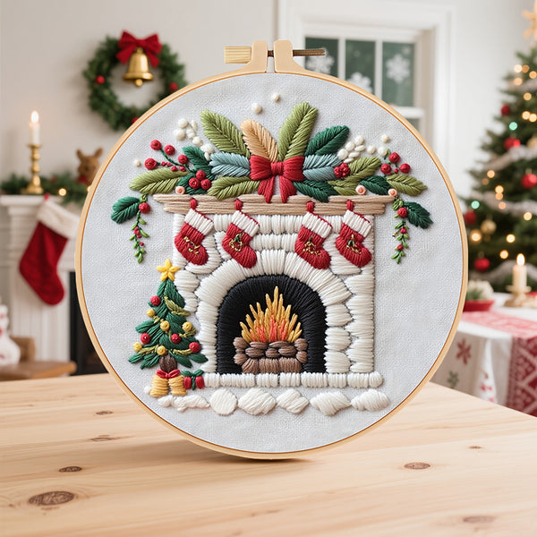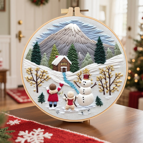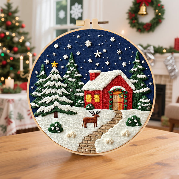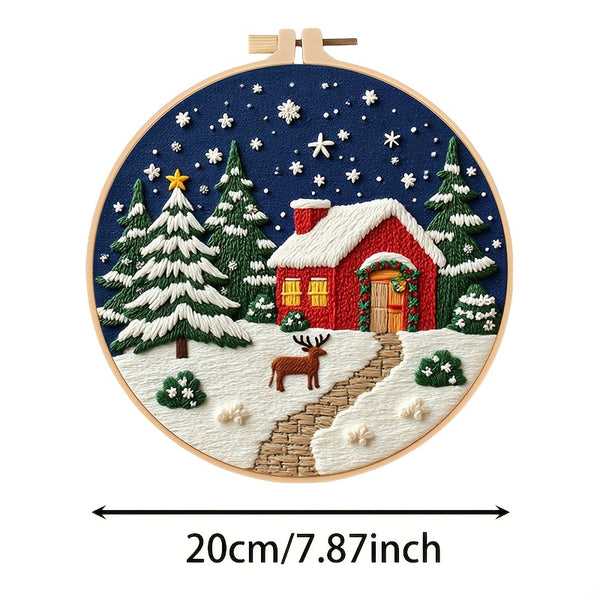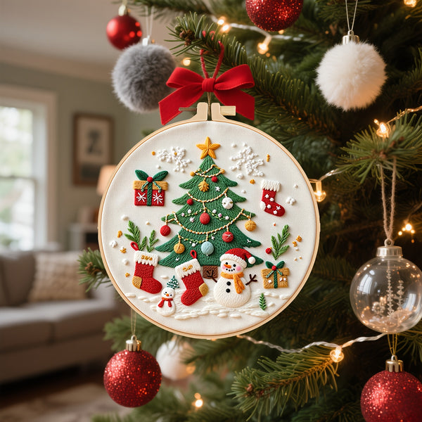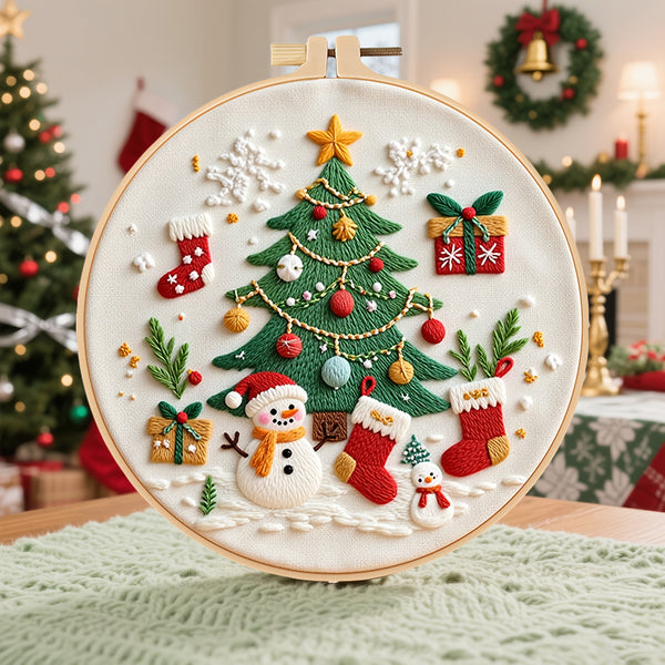 Christmas Tree Embroidery Kit for Beginners – DIY Festive Scene with Stockings, Gifts & Snowman, Pre-Printed Fabric, Hoop, Threads & Needles