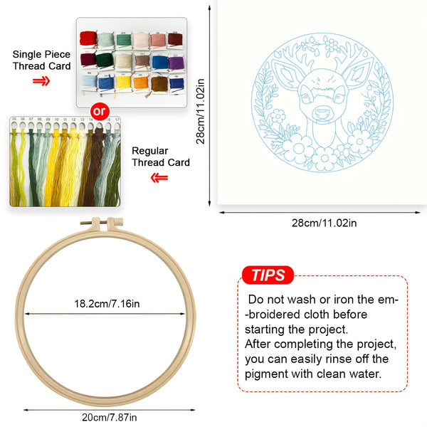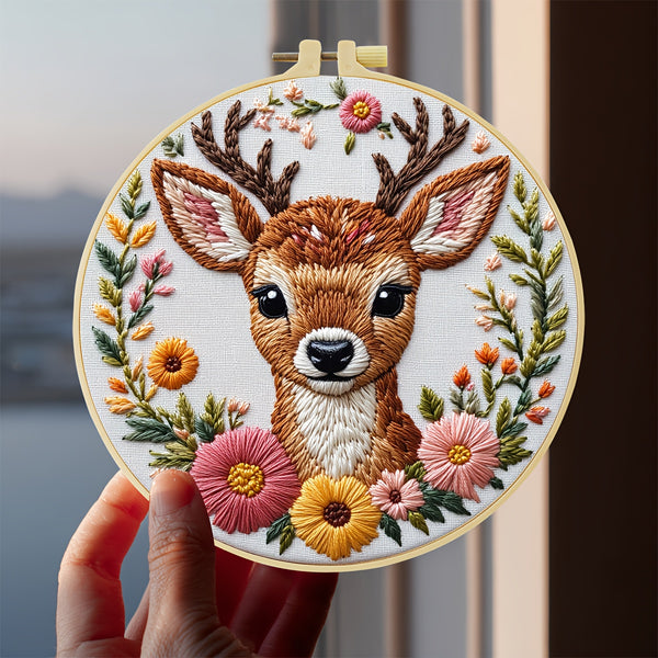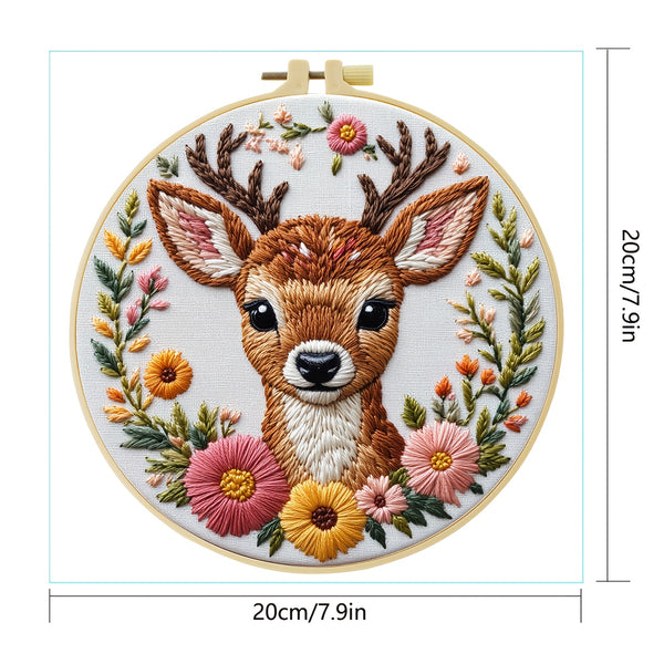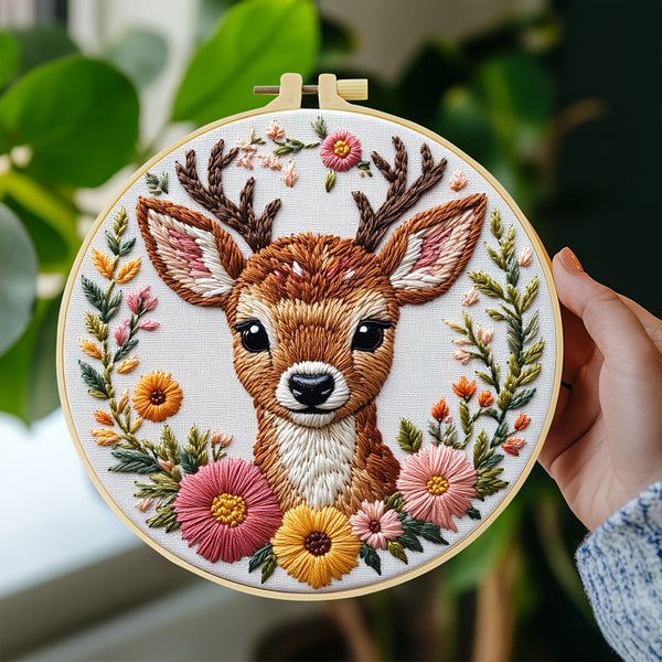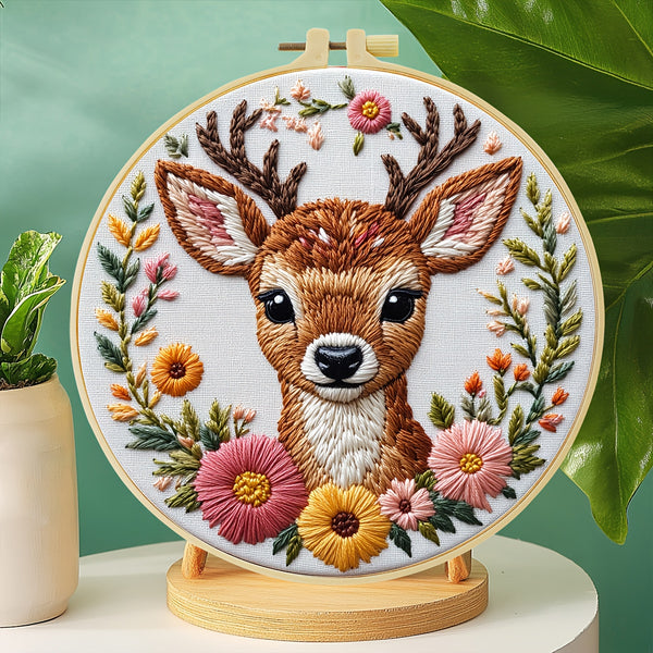Deer Embroidery Kit for Beginners – DIY Woodland Animal with Floral Wreath, Pre-Printed Fabric, Hoop, Threads & Needles – Cute Craft Gift & Decor