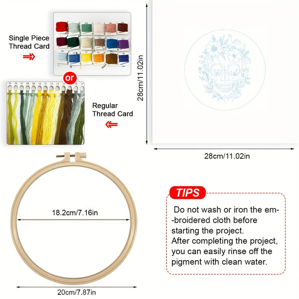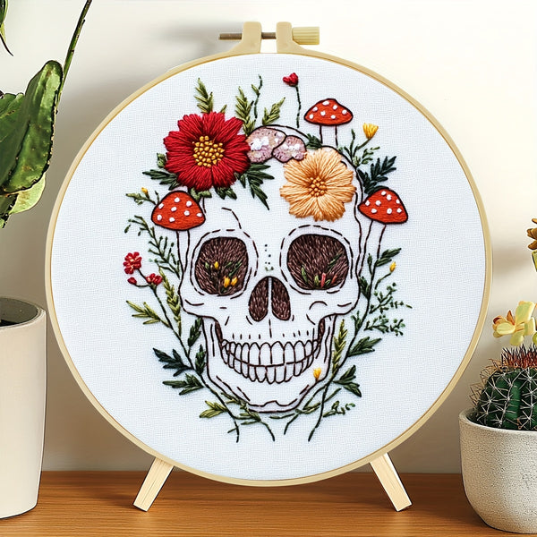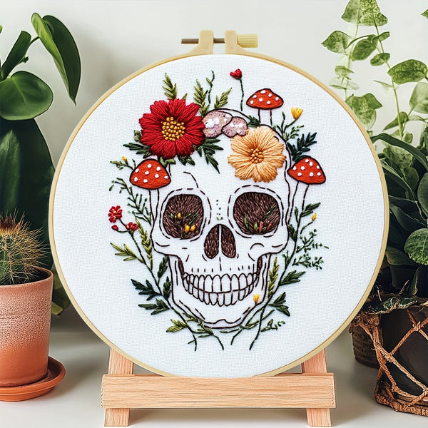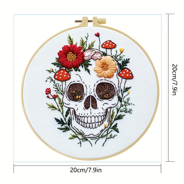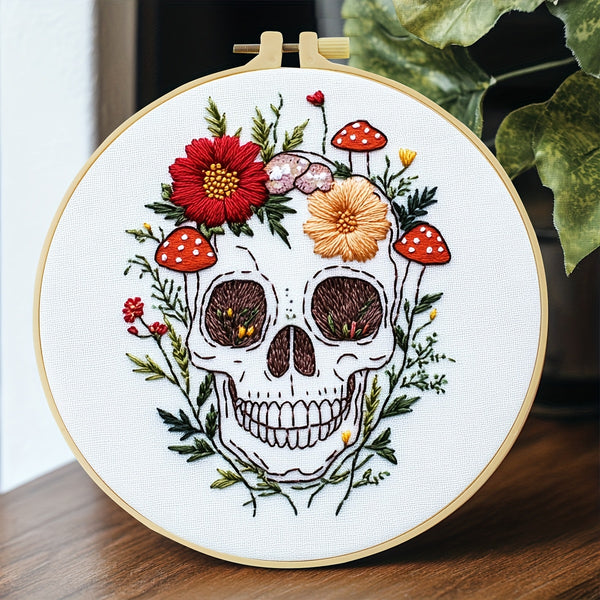 Flower Skull Embroidery Kit – Beginner DIY Stitch Set with Fabric, Hoop & Threads | Handmade Gift for Home Décor & Art Lovers