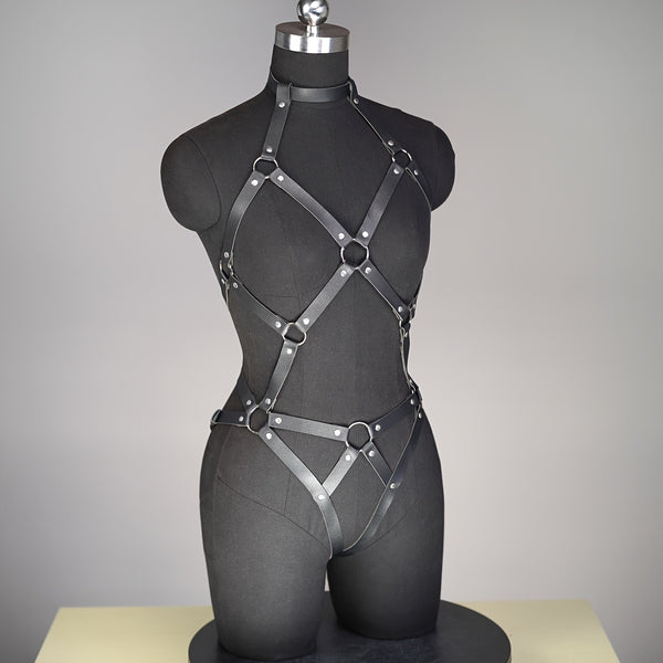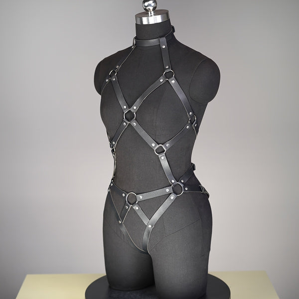 Command attention with this Gothic-inspired full body harness, crafted from durable faux leather and detailed with metallic O-rings and rivets. Designed to flatter all body types, this harness combines a structured silhouette with a rebellious punk aesthetic — perfect for styling over dresses, tops, or bodysuits.