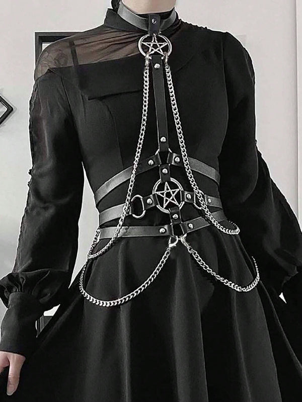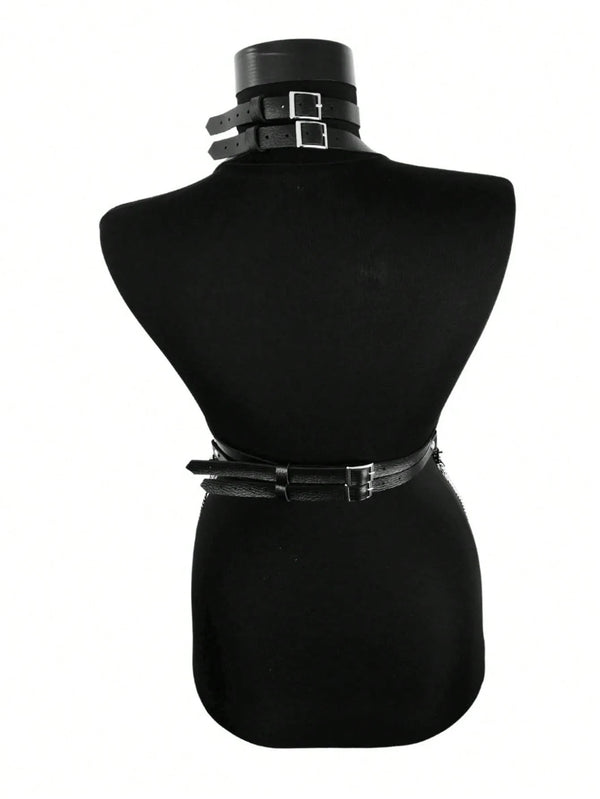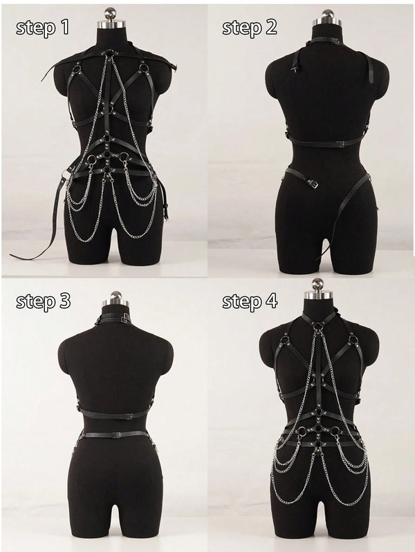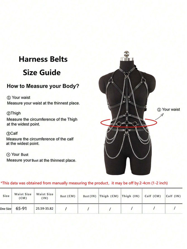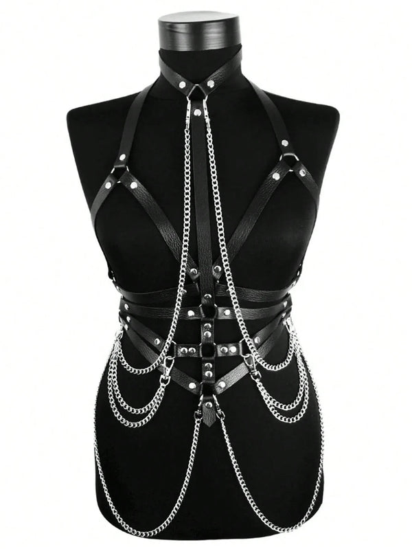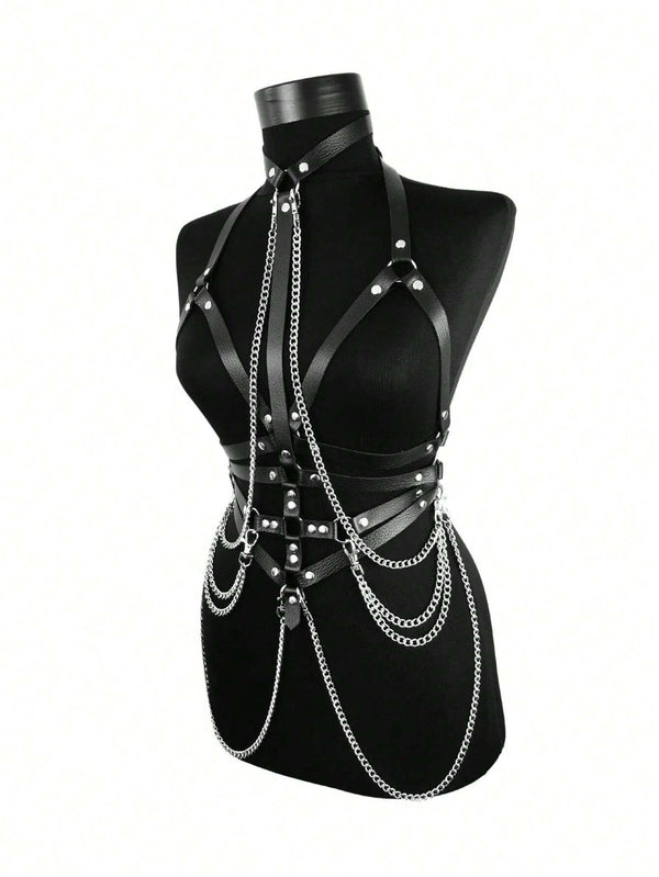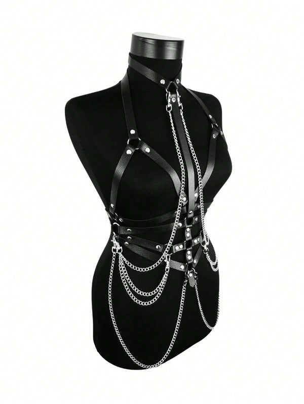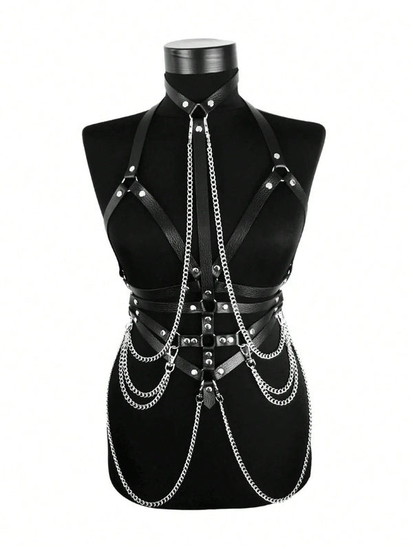 leather body harness, gothic chain belt, punk fashion accessory, women’s bondage belt, festival rave harness, cosplay lingerie, gothic statement piece, adjustable PU harness, body chain outfit