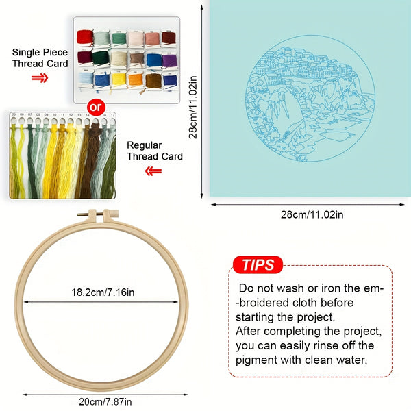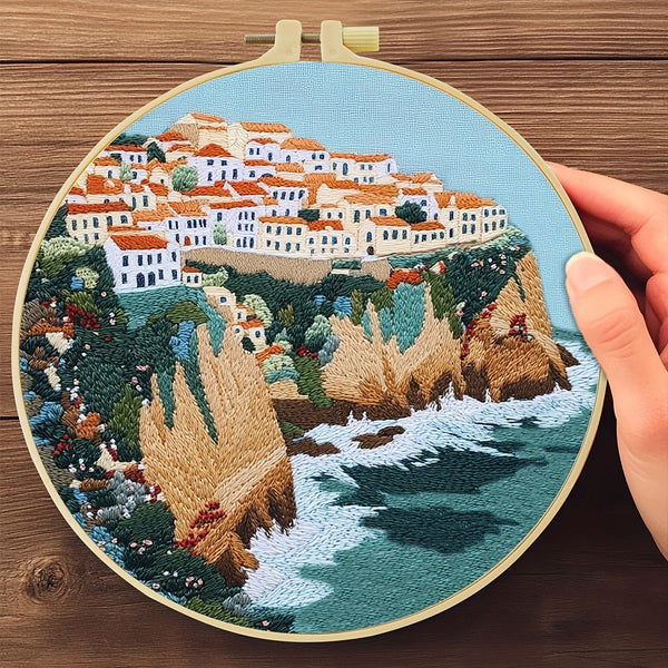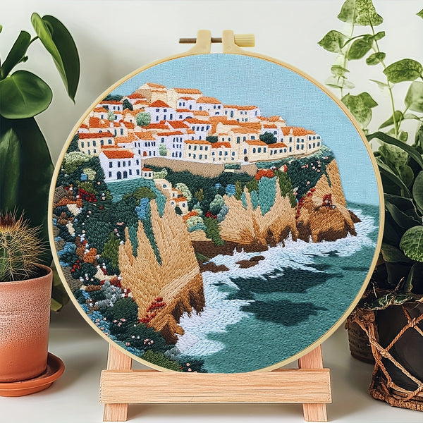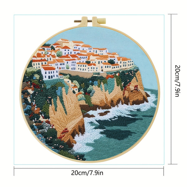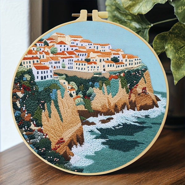Greek Island Embroidery Kit – Beginner DIY Stitch Set with Fabric, Threads & Needle | Mediterranean Village Craft & Home Décor Gift