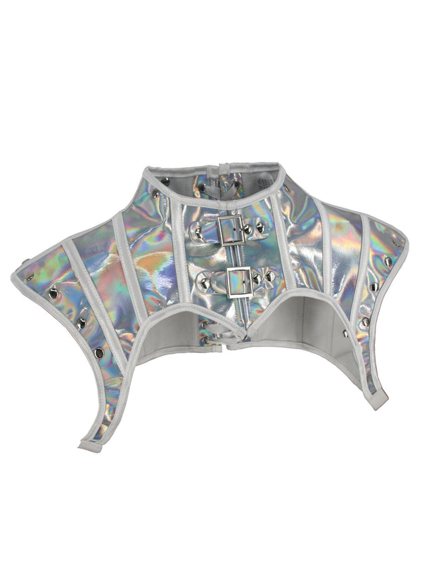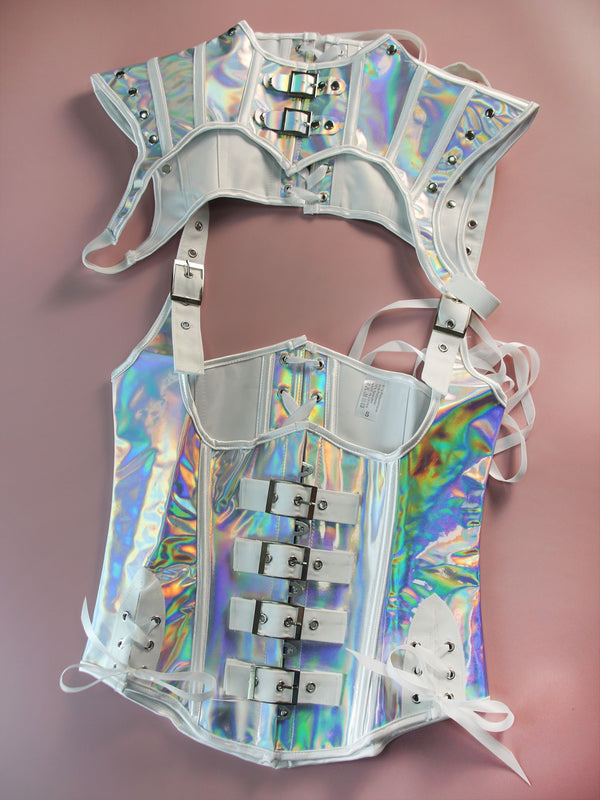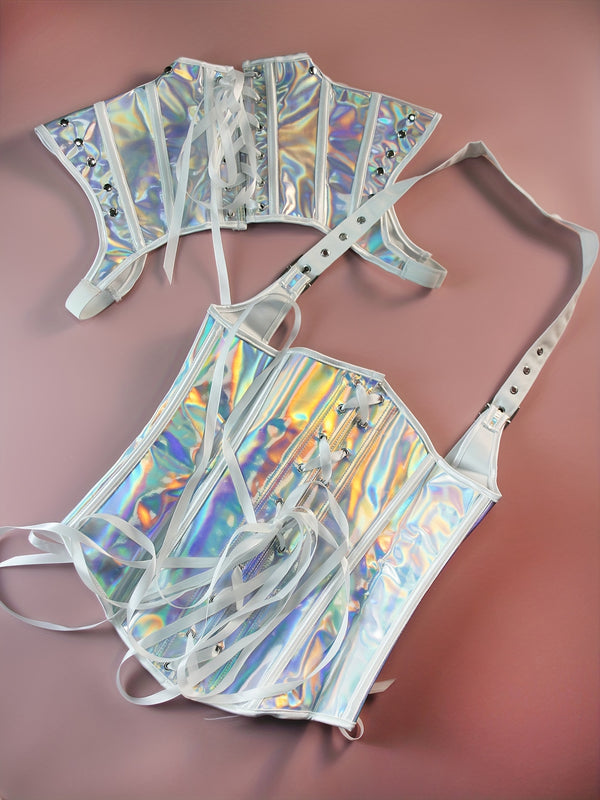 Holographic Cyberpunk Corset Set – Steampunk Shoulder Cape & Buckle Corset | BadBLingerie Sci-Fi Festival Outfit, Halloween Cosplay, Futuristic Gothic Fashion