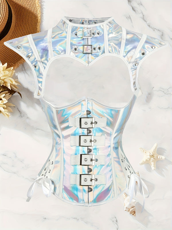 Command attention with this Rock Steampunk Corset and Shoulder Cape Set — a futuristic fusion of cyberpunk radiance and vintage corsetry. Featuring a striking holographic metallic finish, structured buckle straps, and silver rivet details, this piece transforms you into a sci-fi fantasy heroine.