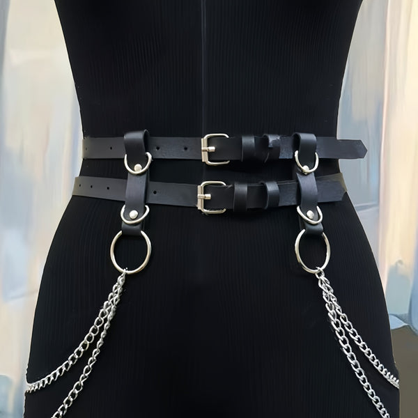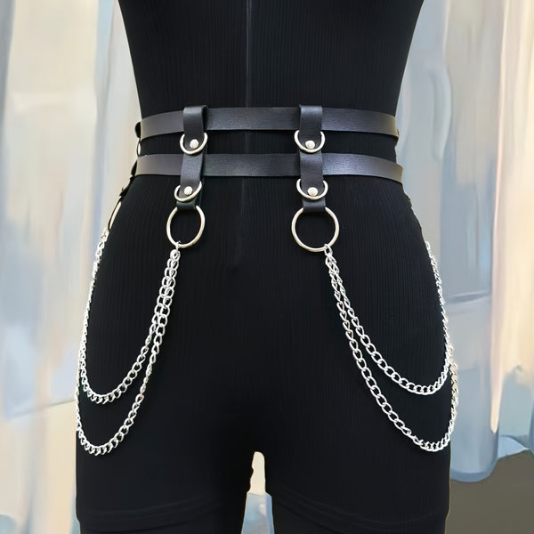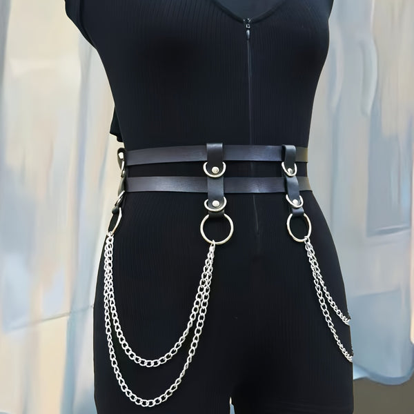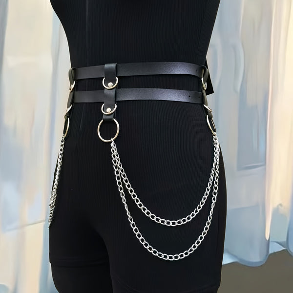 Made from premium faux leather and adorned with metal O-rings and cascading chains, this piece blends gothic style with modern streetwear appeal.