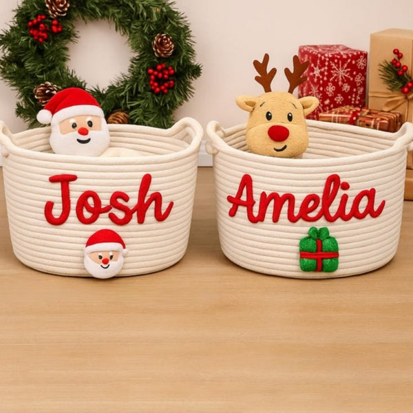 Personalized Christmas Basket โ Custom Name Rope Storage Bin with Festive Design | Holiday Gift Organizer for Toys, Clothes & Home Dรฉcor