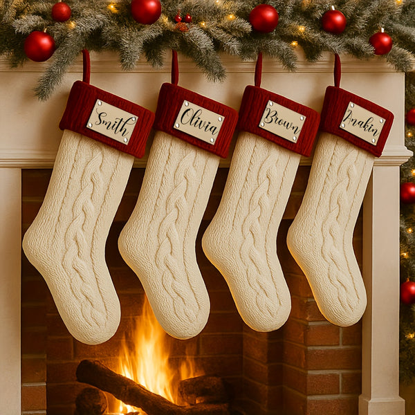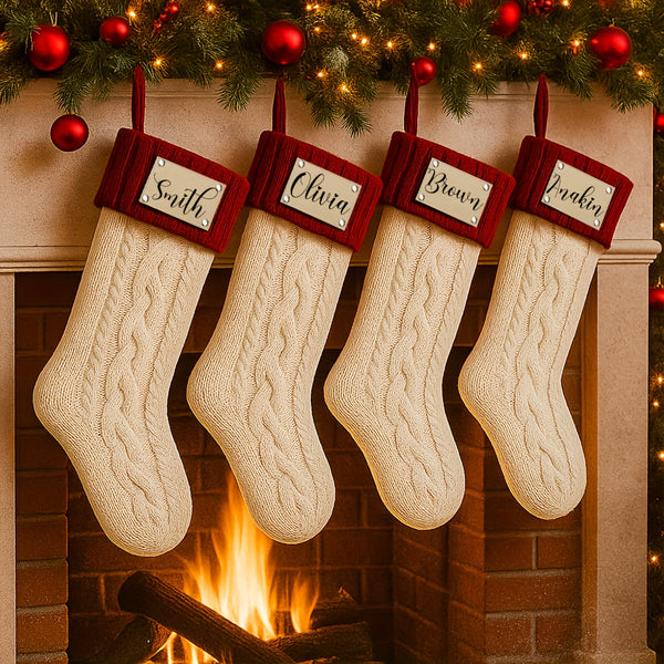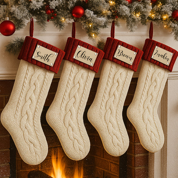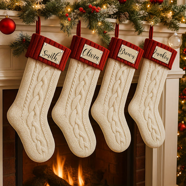 Each stocking is made from soft, thick yarn with a cozy cable-knit pattern and topped with a rich red cuff, featuring your personalized name or message in elegant script. These stockings add warmth and sophistication to any mantel, making Christmas morning extra special.