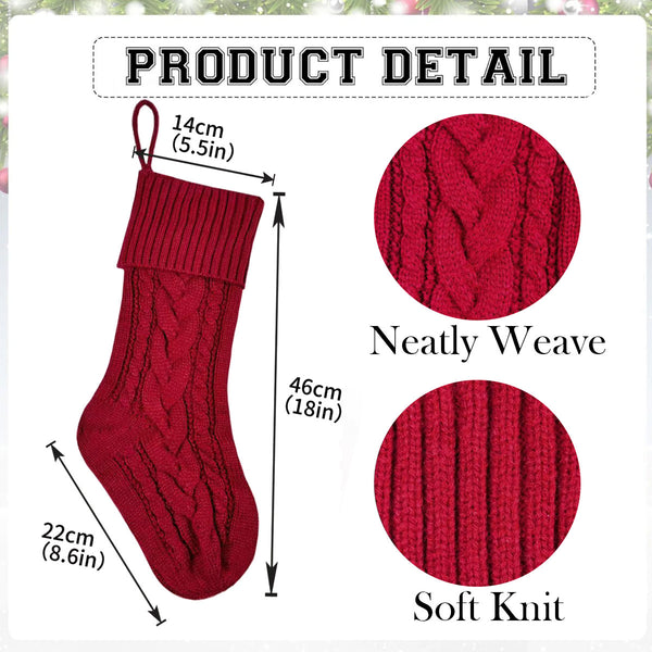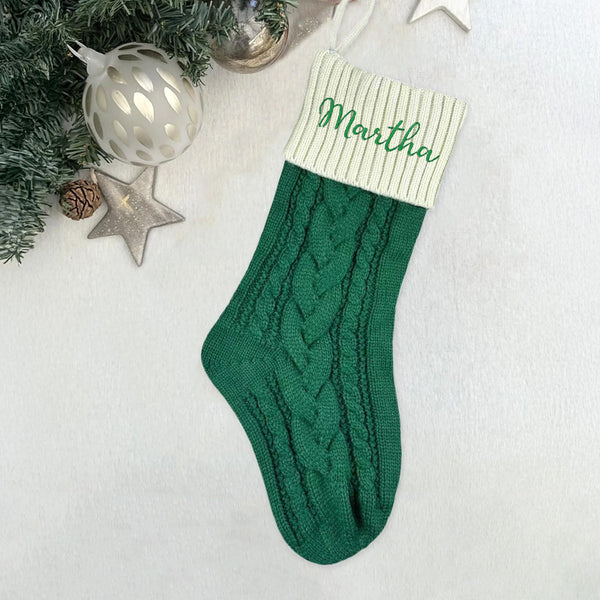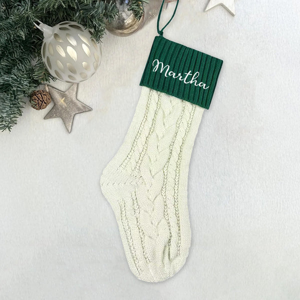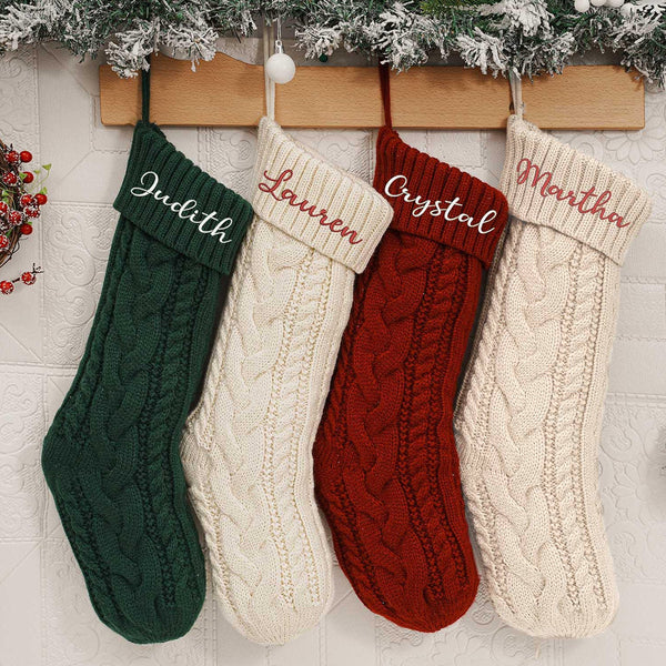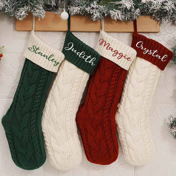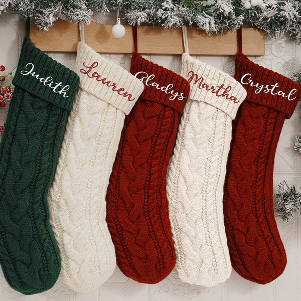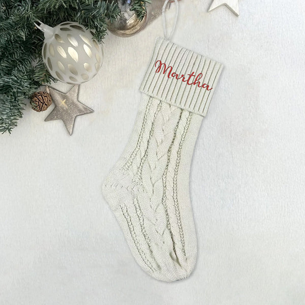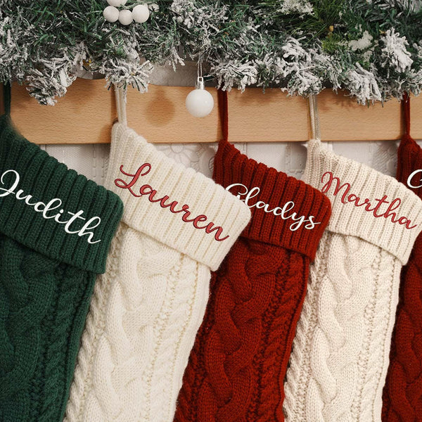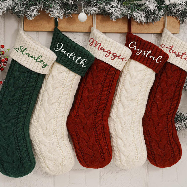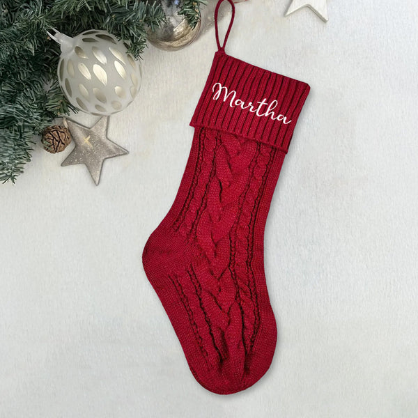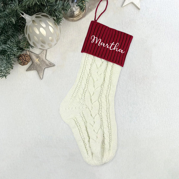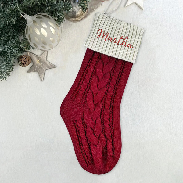 Each stocking is made from soft, thick yarn with a cozy cable-knit pattern and topped with a rich red cuff, featuring your personalized name or message in elegant script. These stockings add warmth and sophistication to any mantel, making Christmas morning extra special.