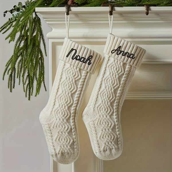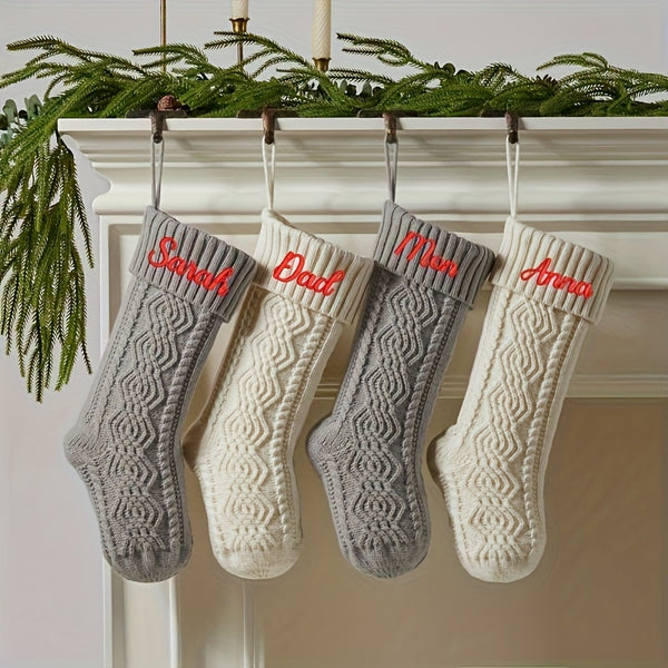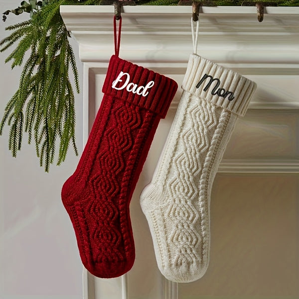 Each stocking is made from soft, thick yarn with a cozy cable-knit pattern and topped with a rich red cuff, featuring your personalized name or message in elegant script. These stockings add warmth and sophistication to any mantel, making Christmas morning extra special.