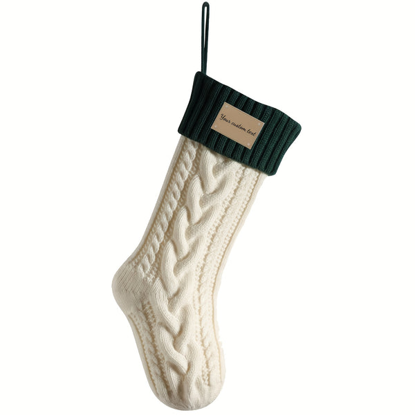 Each stocking is made from soft, thick yarn with a cozy cable-knit pattern and topped with a rich red cuff, featuring your personalized name or message in elegant script. These stockings add warmth and sophistication to any mantel, making Christmas morning extra special.