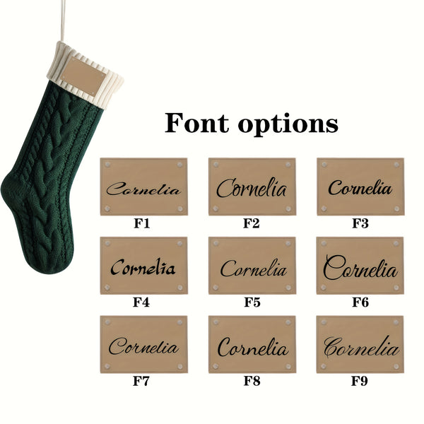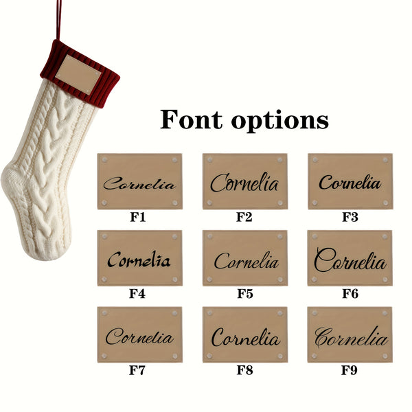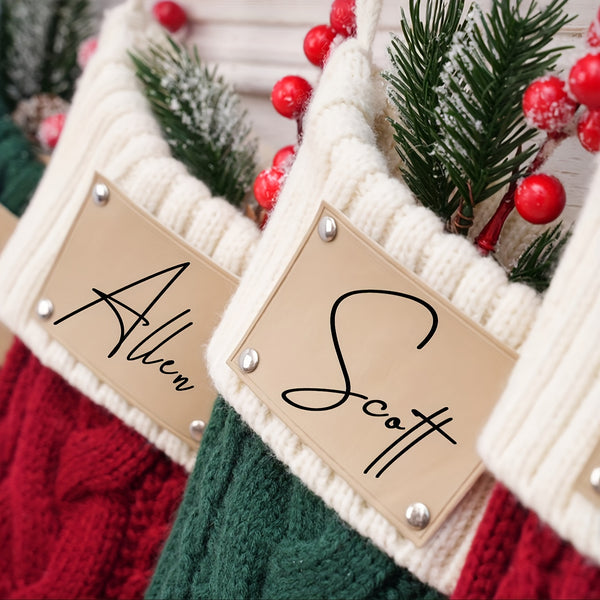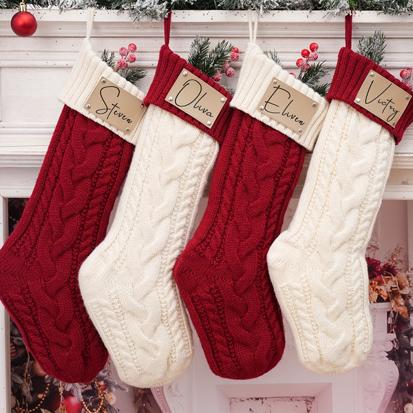 Each stocking is made from soft, thick yarn with a cozy cable-knit pattern and topped with a rich red cuff, featuring your personalized name or message in elegant script. These stockings add warmth and sophistication to any mantel, making Christmas morning extra special.