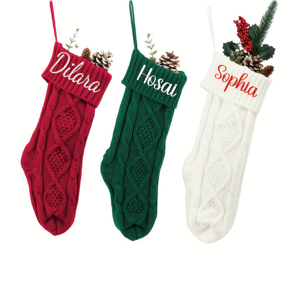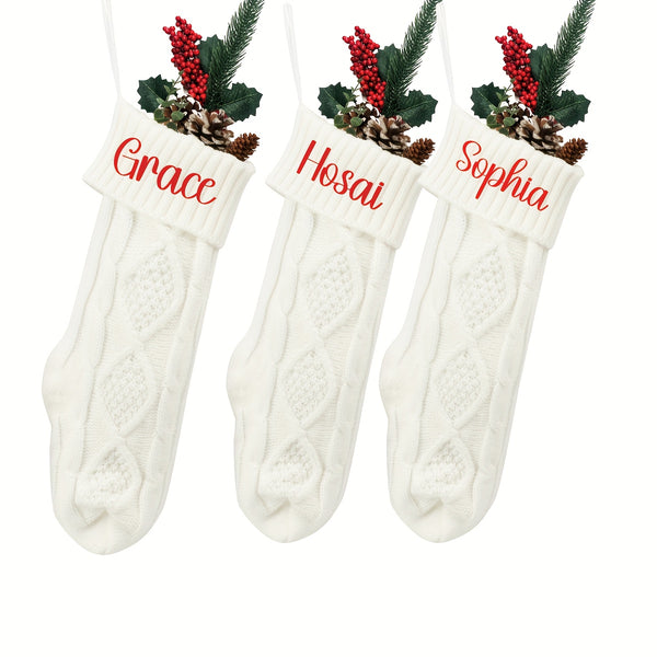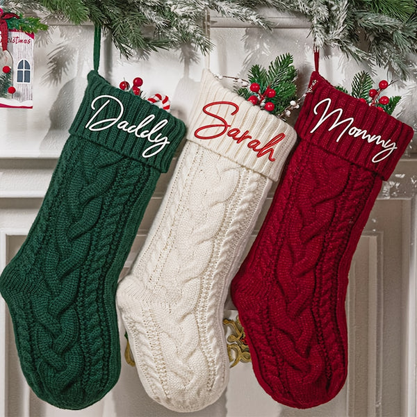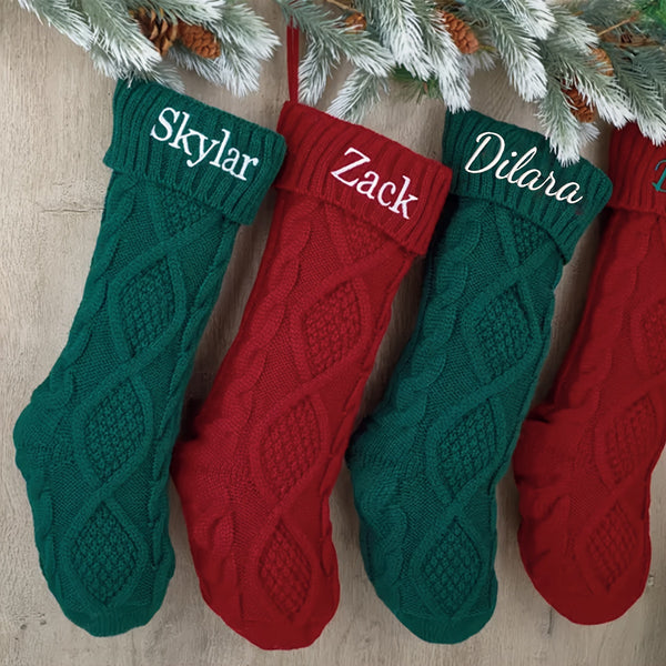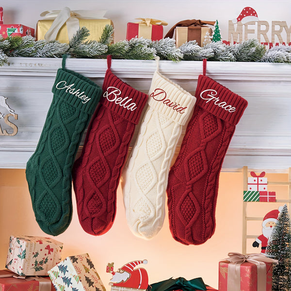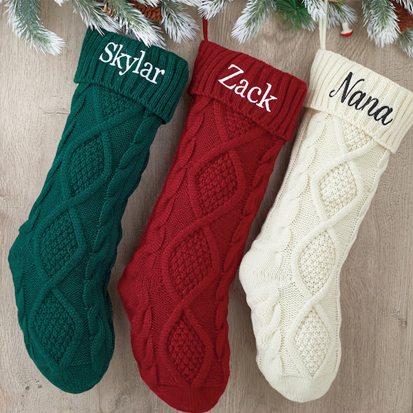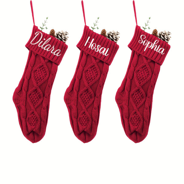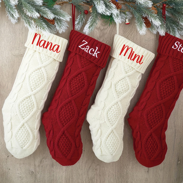 Each stocking is made from soft, thick yarn with a cozy cable-knit pattern and topped with a rich red cuff, featuring your personalized name or message in elegant script. These stockings add warmth and sophistication to any mantel, making Christmas morning extra special.
